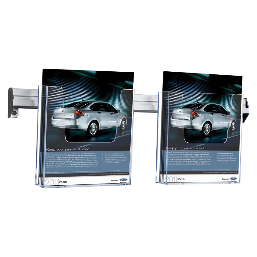 Silvereloxerad skena kombinerat med broschyrställ i glasklar akryl. 2 x A5