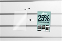 Skylthållare i 2 mm genomskinlig klar akryl, till montering på slatwall/spårpanel. Presentera dina displays och plakat med erbjudanden, upplysningar och information på spårpanel. Du ska bara öppna baksidan på skylthållarna och sätta in ditt plakat från sidan. Därefter stänger du baksidan och klickar skylthållarens topdel fast i spåret på din slatwall/spårpanel. Fås i storlekarna: A7, A6, A5, & A4 !