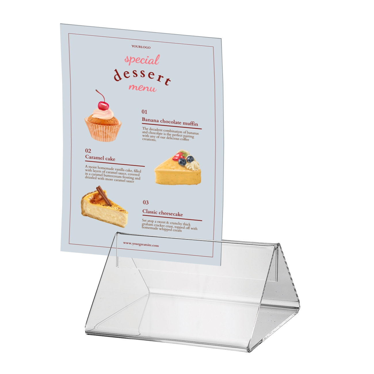 Dessa praktiska och stilrena akryl skylt­hållare är perfekta för att visa menyer eller information på bord och diskar. Den dubbelsidiga designen gör det enkelt att visa innehåll från båda sidor, och materialet möjliggör snabb och smidig uppdatering. Den kompakta storleken gör dem idealiska för mindre bord, medan det starka akrylet ger en hållbar och professionell lösning.