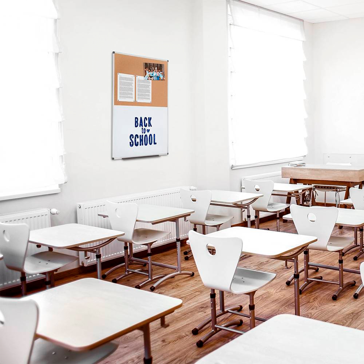 Denna 120x90 cm Combi Board whiteboard med kork är en elegant, multifunktionell tavla. Med en snygg ram i aluminium och en uppdelad yta på 50/50 mellan vit yta och kork ger tavlan ett elegant och rent utseende som passar till alla kontorsmiljöer - både på arbetsplatsen och i hemmet. Korken gör tavlan multifunktionell, då den verkar även som en anslagstavla. Perfekt till vägguppsättning.