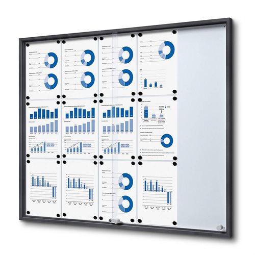 15xA4 Skyltskåp tillverkat i metall och aluminium, med magnetiskt skrivbart whiteboard-bakstycke med ett inre djup på 23 mm, smal antracitgrå profilram, skjutdörrar av 4 mm säkerhetsglas med inbyggd lås. 2 nycklar medföljer. Kan användas med whiteboardpennor och magneter.