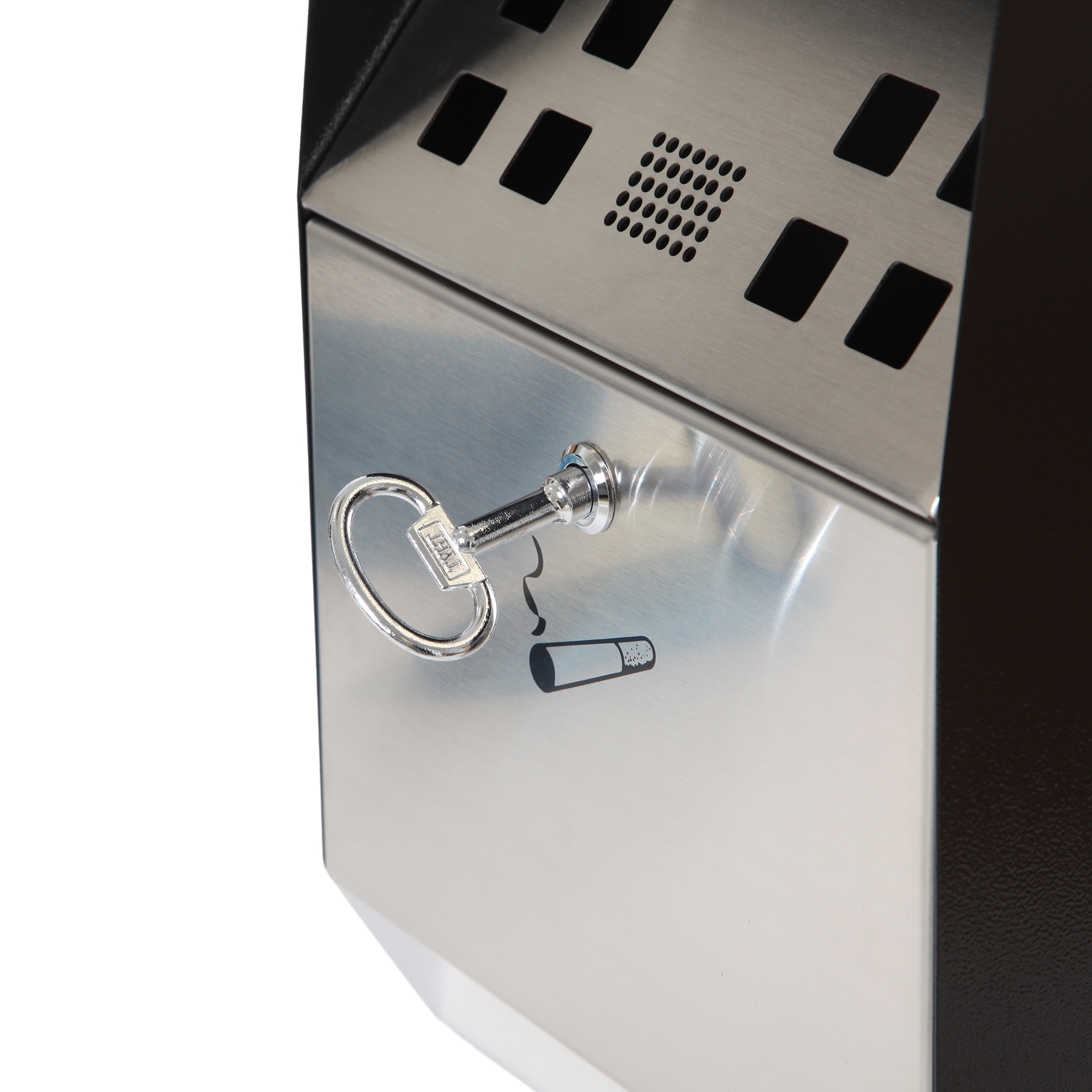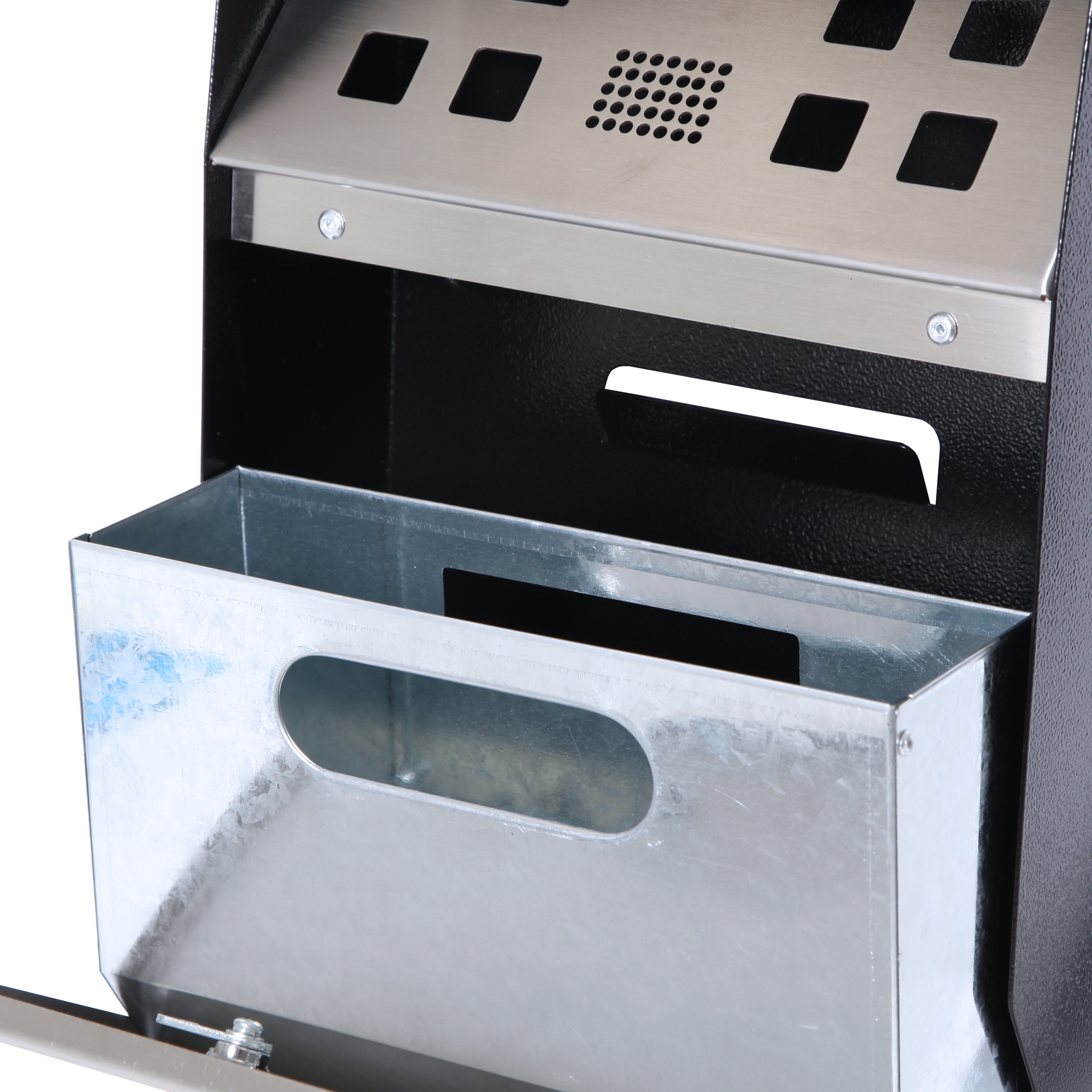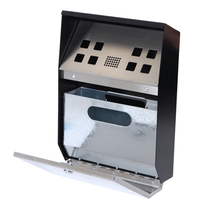 En kvalitetsstark och väderbeständig utomhus askkopp för väggmontering, tillverkad i svart pulverlackerat galvaniserat stål med en front i rostfritt stål 316. Materialkombinationen ger mycket god motståndskraft mot rost och gör askkoppen väl lämpad för både offentliga miljöer och kustområden. Askkoppen har flera inkast med grill samt en låsbar front som gör både användning och tömning enkel och säker.
