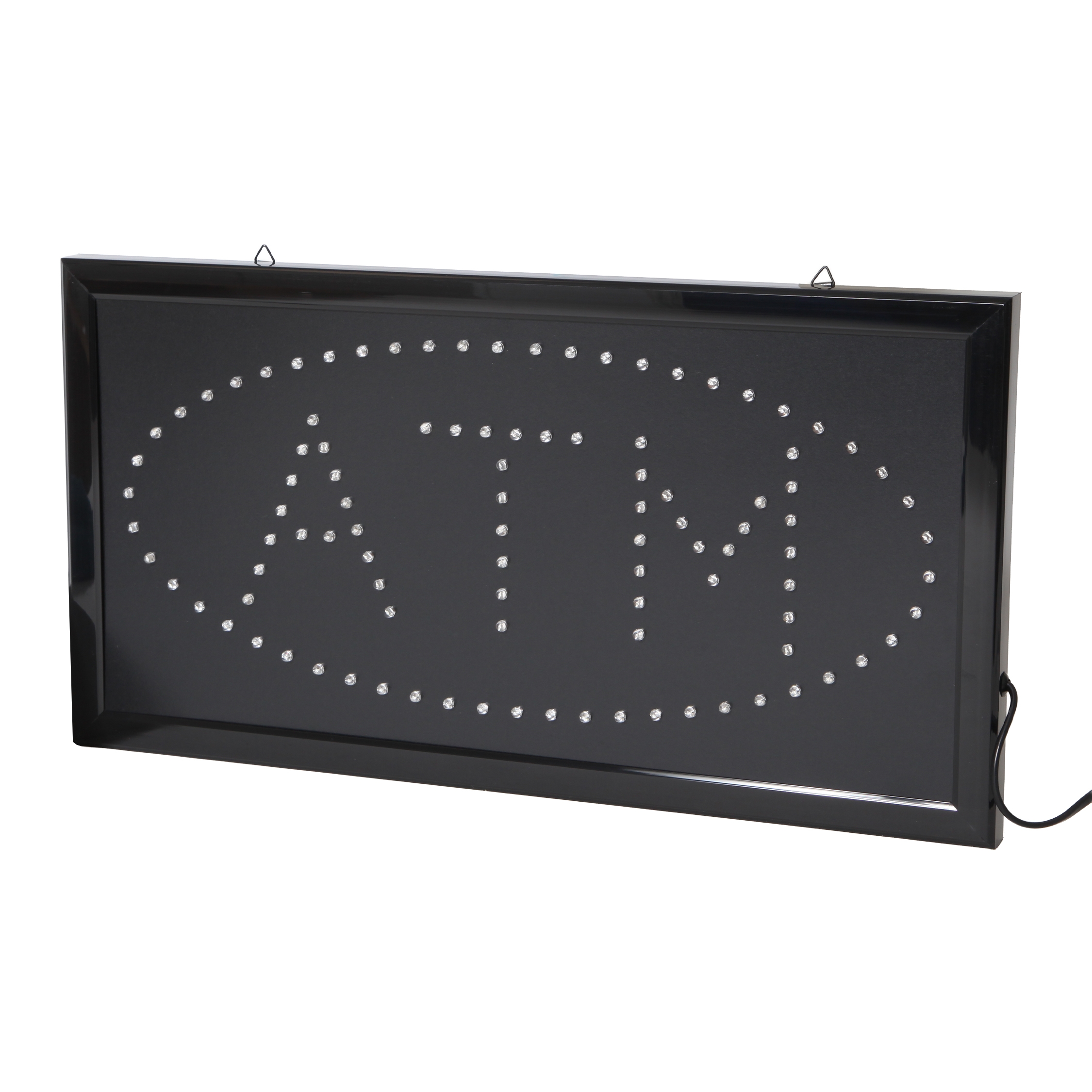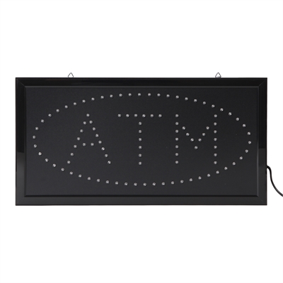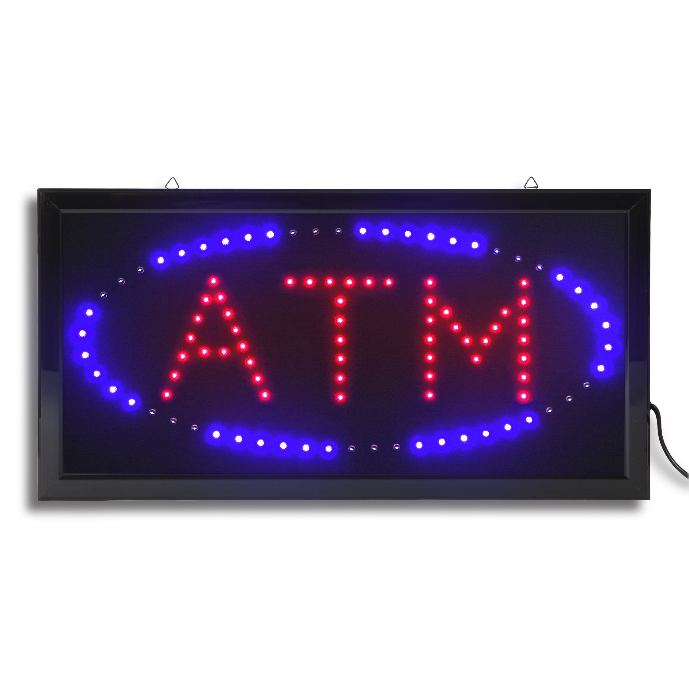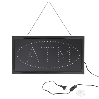 Mycket stark blå och röd LED-ljusskylt med ordet "ATM" för upphängning i fönster eller på vägg.