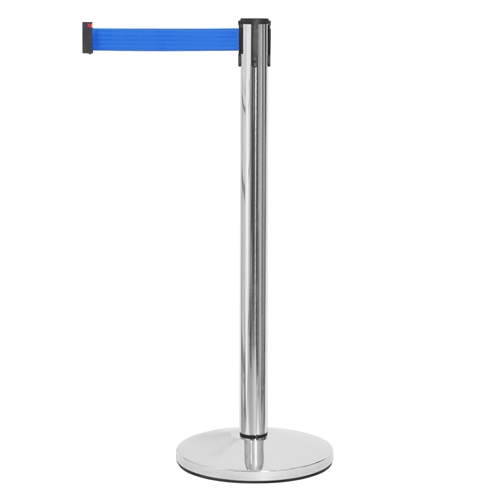 Avspärrningsstolpe tillverkad i galvaniserad stål med en tung och stabil betongfylld fot med golvskydd.