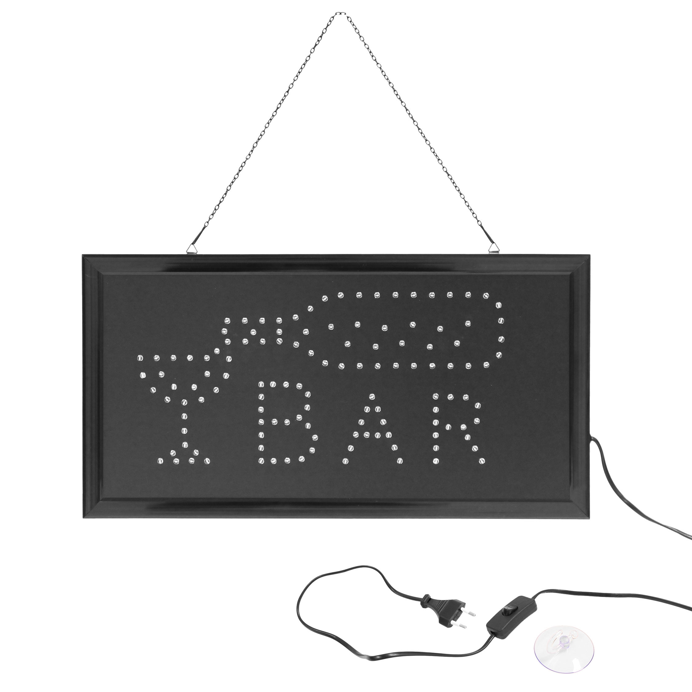 Elektronisk LED skylt med super kraftigt blått, rött och gult ljus med texsten "BAR" samt en skänkande flaska bubbler, till upphängning i fönster eller på vägg.