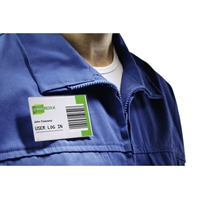 Namnskylt 54x90mm med säkerhetsnål och klämma som ger valmöjlighet vid fäste på kläder.