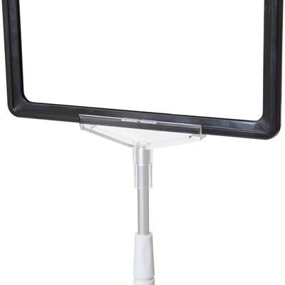 Genomskinlig T-hållare på toppen av stången som passar alla ramfärger. Ramen är tillverkad av svart plast och har toppöppning (porträttformat / lodrätt).