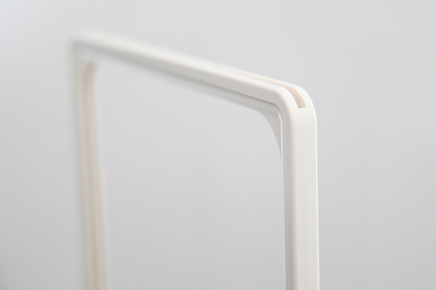 T-hållaren på toppen av stången är genomskinlig och passar med alla ramfärger. Ramen är tillverkad av vit plast och har toppöppning (porträttformat / lodrätt).