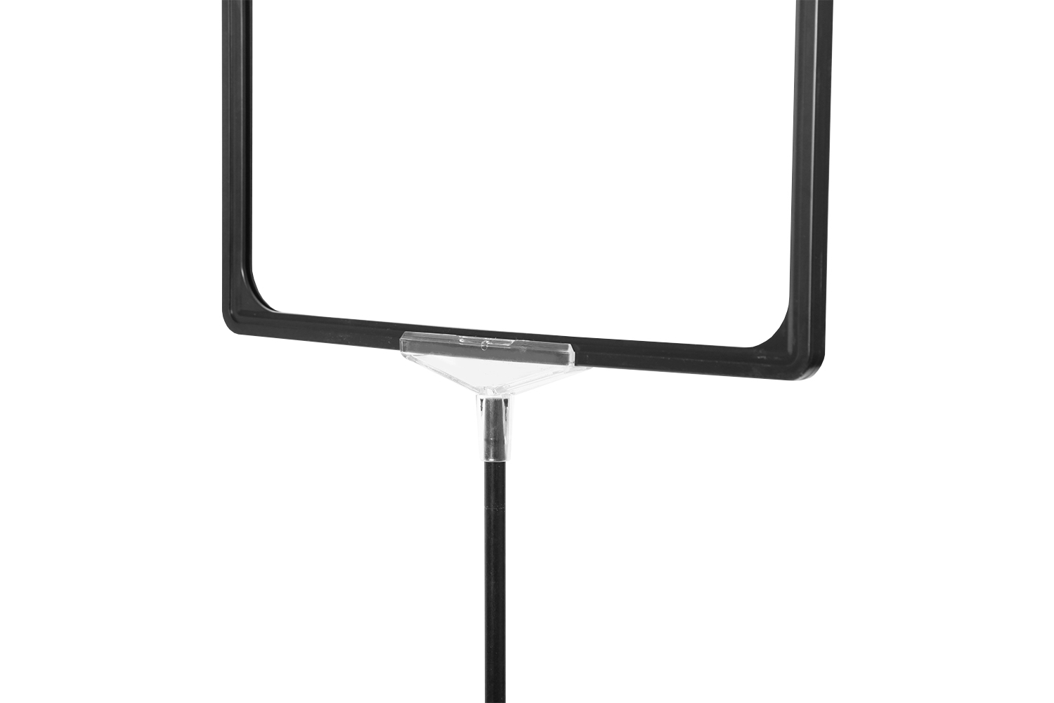 Skylthållaren är försedd med en teleskopstång som kan justeras från 32 till 62 cm i höjd samt en plastram med toppöppning (stående).