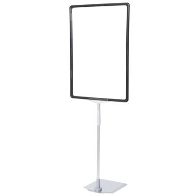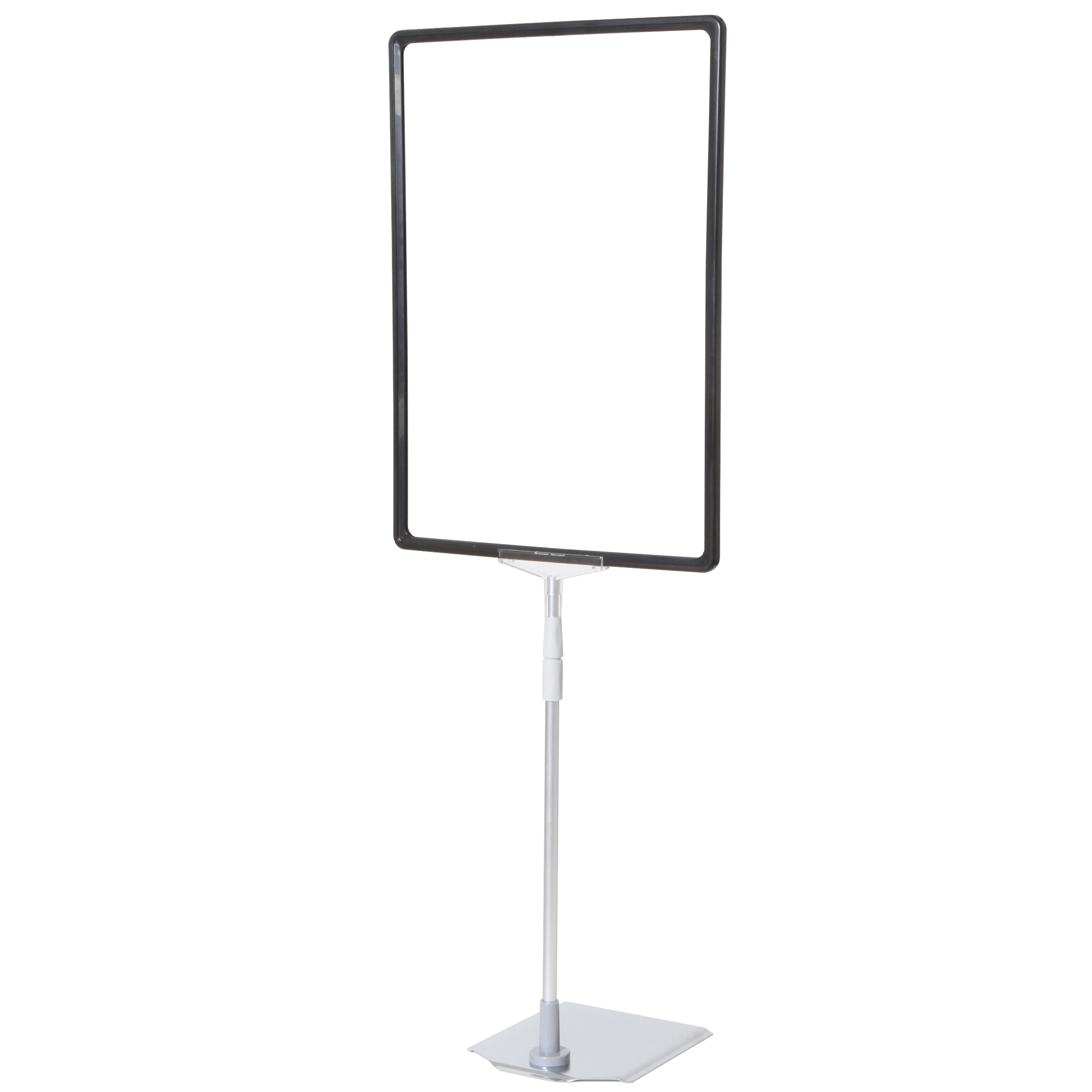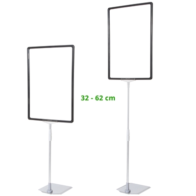 Skyltställ av toppkvalitet med en snygg, tung och stabil metallfot med kromad yta, justerbar silveranodiserad aluminium teleskopstång (32 till 62 cm) och svart ABS-plastram i A3-storlek.
