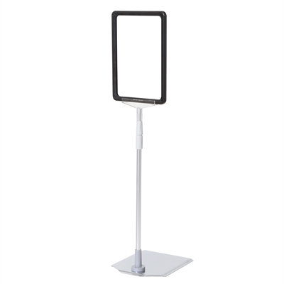 Skyltställ av toppkvalitet med en snygg, tung och stabil metallfot med kromad yta, justerbar silveranodiserad aluminium teleskopstång (32 till 62 cm) och svart ABS-plastram i A5-storlek.