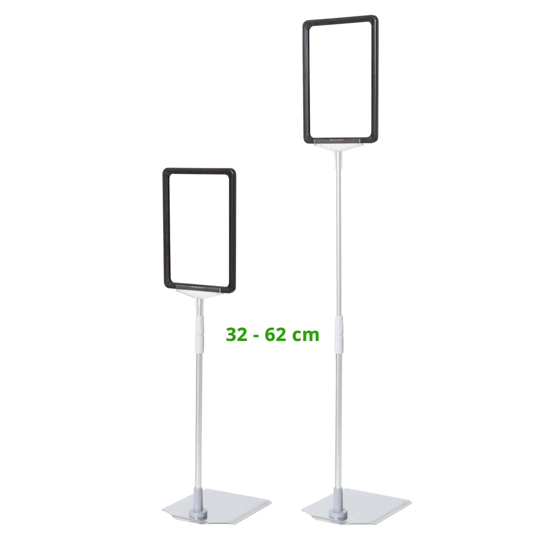 Skyltstället är utrustat med en teleskopstång som kan justeras från 32 till 62 cm i höjd, samt en A5 ABS-plastram med öppning upptill (stående format).