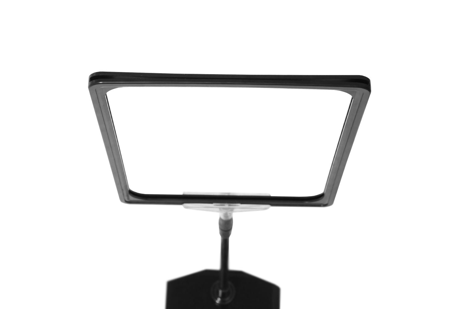 Skylthållare av bästa kvalitet med en svart metallfot. Vi rekommenderar att man ställer något på foten för extra stabilitet och den kan användas både inom- och utomhus.