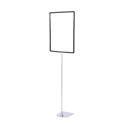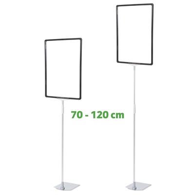 Skylthållare av toppkvalitet med en snygg, tung och stabil metallfot med kromad yta, justerbar silveranodiserad aluminium XL teleskopstång (70 till 120 cm) och svart ABS-plastram i A3.
