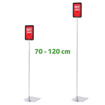 Skylthållaren är utrustad med en extra lång teleskopstång som kan justeras från 70 till 120 cm i höjd.