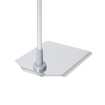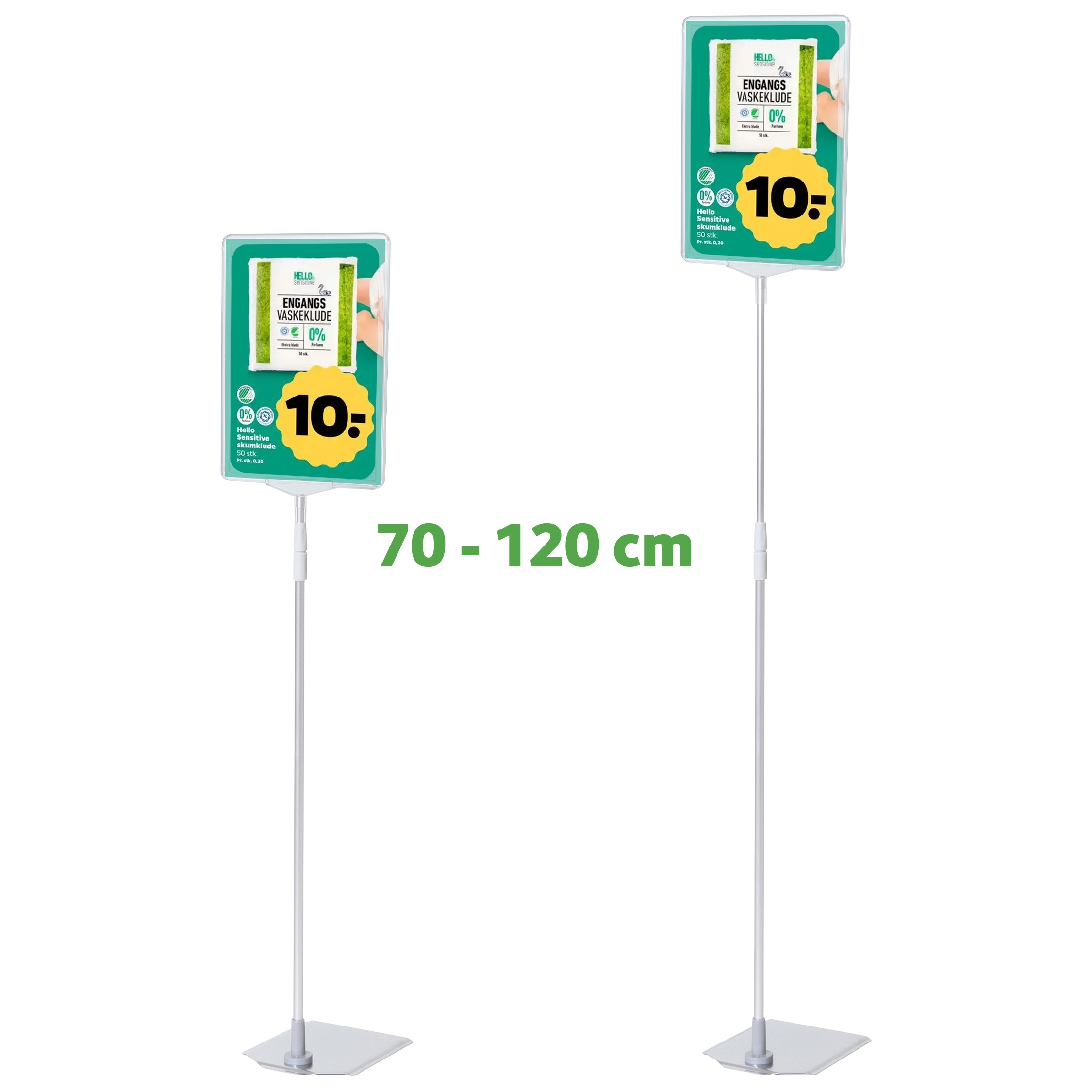 Skylthållare av toppkvalitet med en snygg, tung och stabil metallfot med kromad yta, justerbar silveranodiserad aluminium XL teleskopstång (70 till 120 cm) och transparent ABS-plastram i A4.