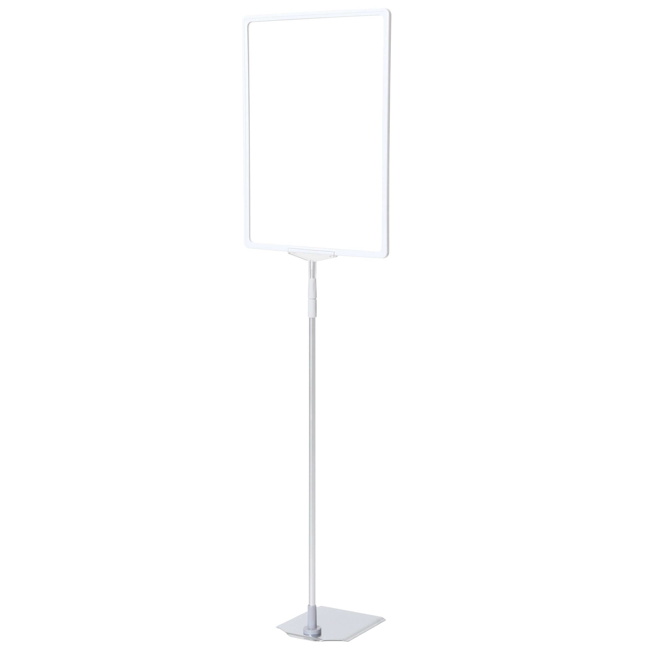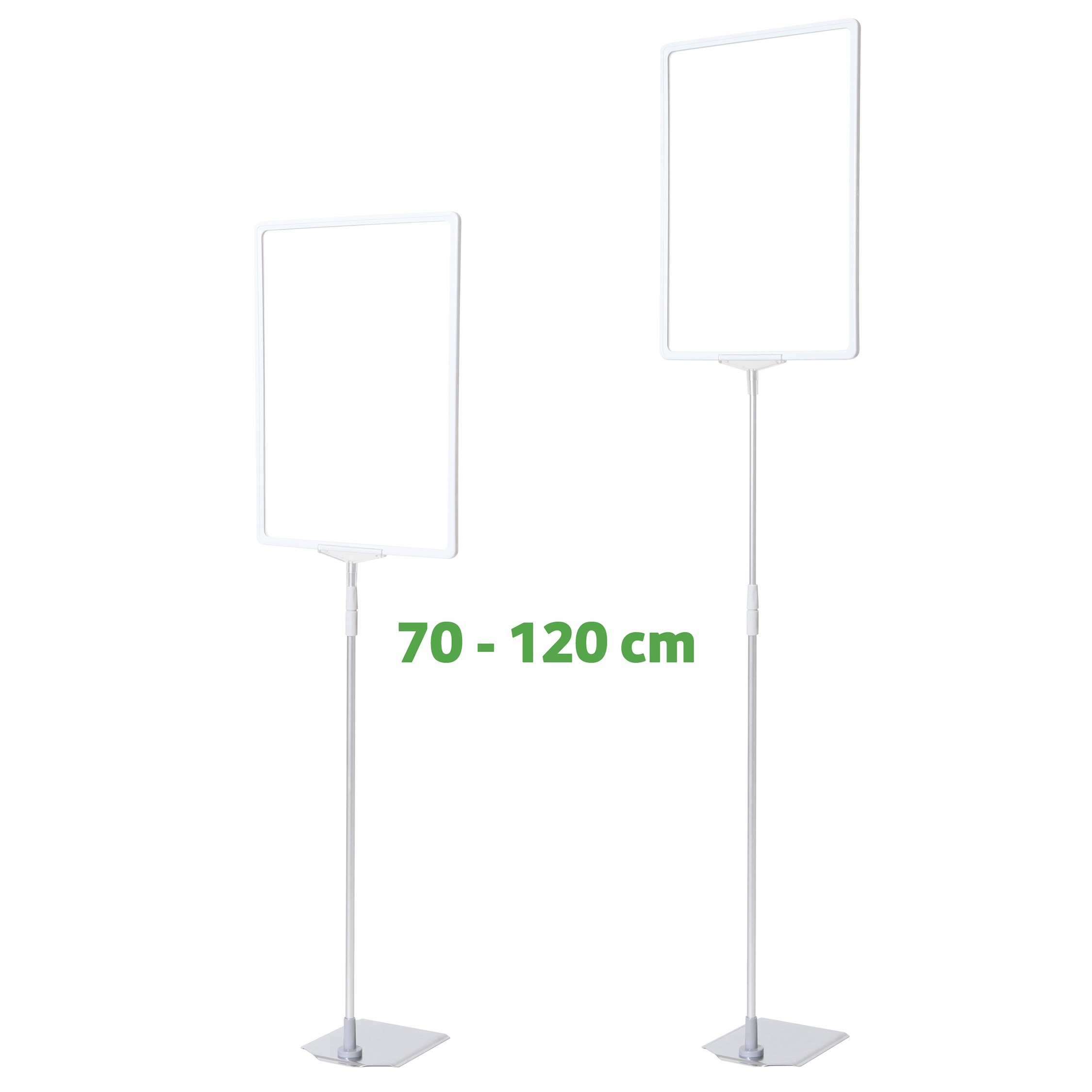 Skylthållare av toppkvalitet med en snygg, tung och stabil metallfot med kromad yta, justerbar silveranodiserad aluminium XL teleskopstång (70 till 120 cm) och vit ABS-plastram i A3.