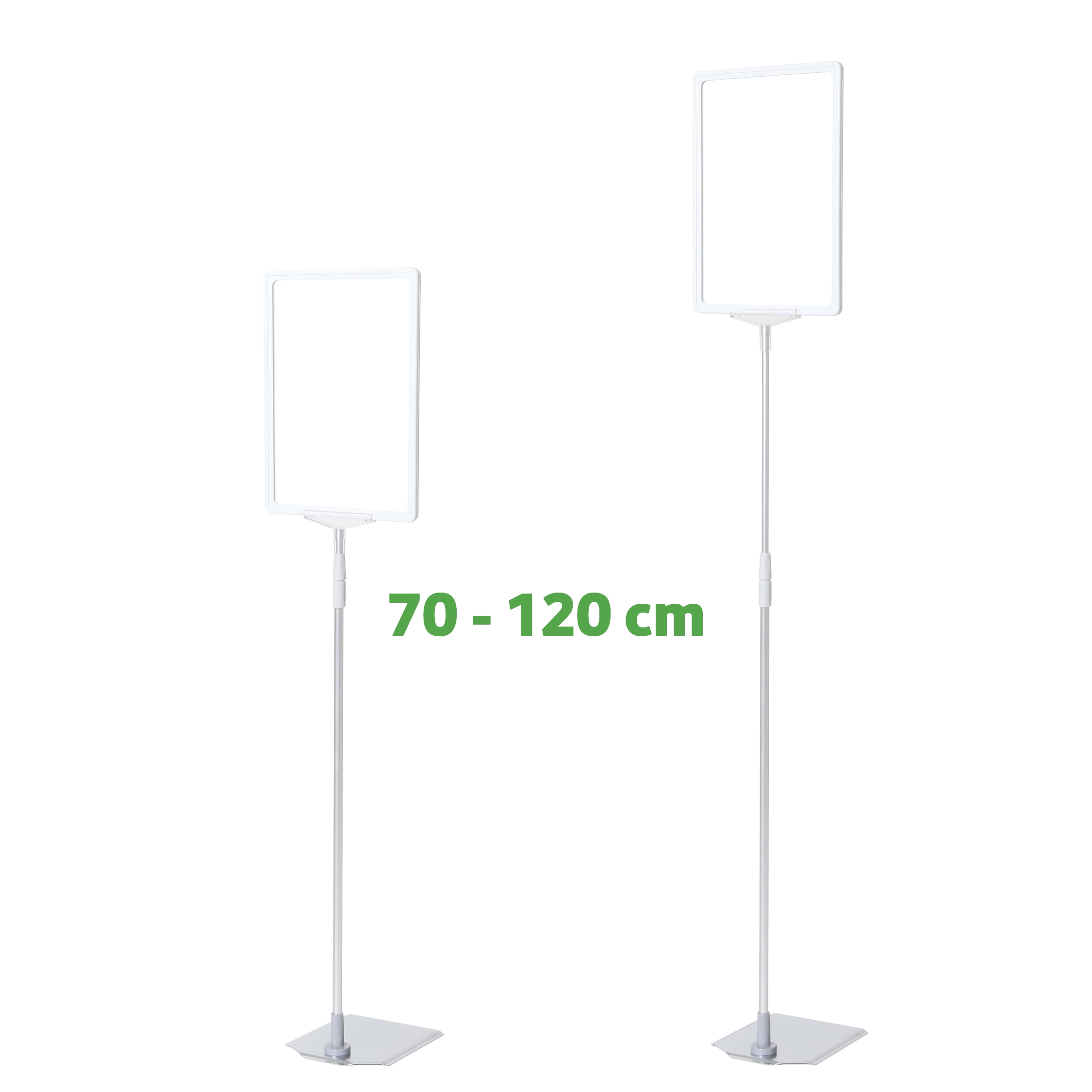 Skylthållare av toppkvalitet med en snygg, tung och stabil metallfot med kromad yta, justerbar silveranodiserad aluminium XL teleskopstång (70 till 120 cm) och vit ABS-plastram i A4.