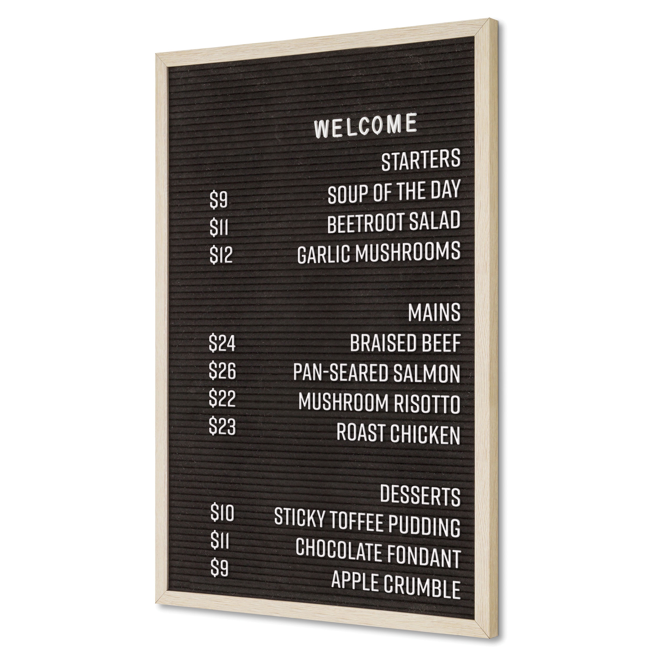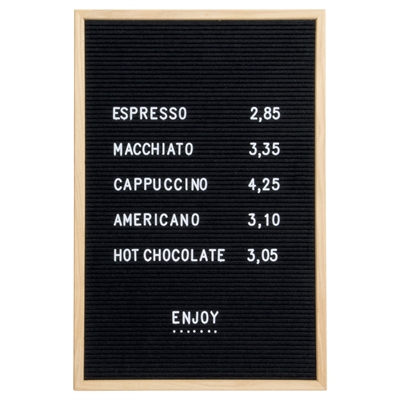 Klassisk Letter Board i stilren design med svart filt och ram i ljust teakträ. Skapa synlig och elegant kommunikation med en modern vintage-look!