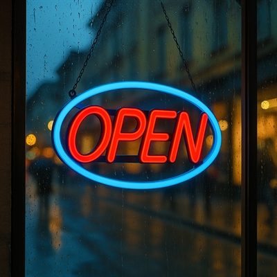 • Lysande OPEN LED-neonskylt i röd och blå