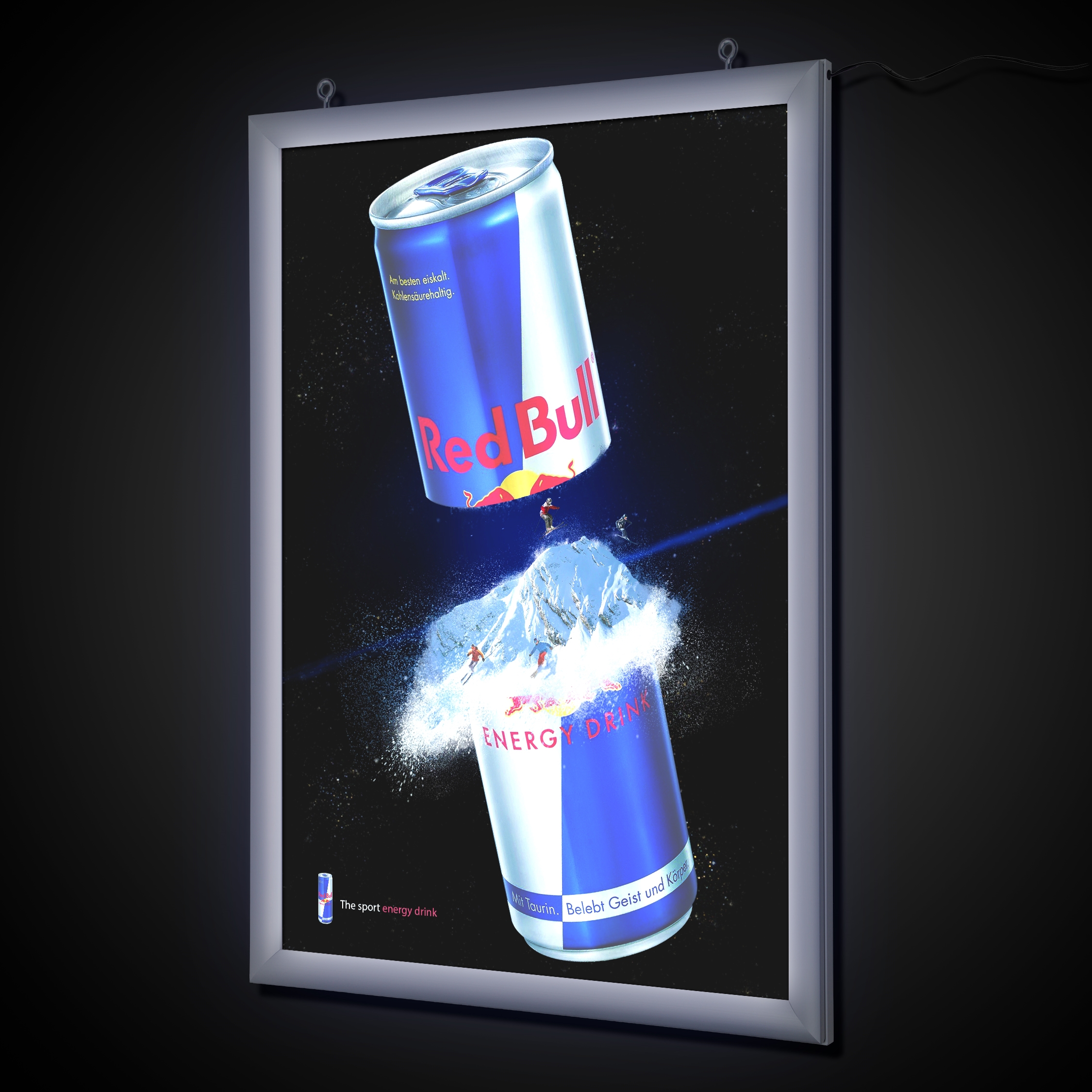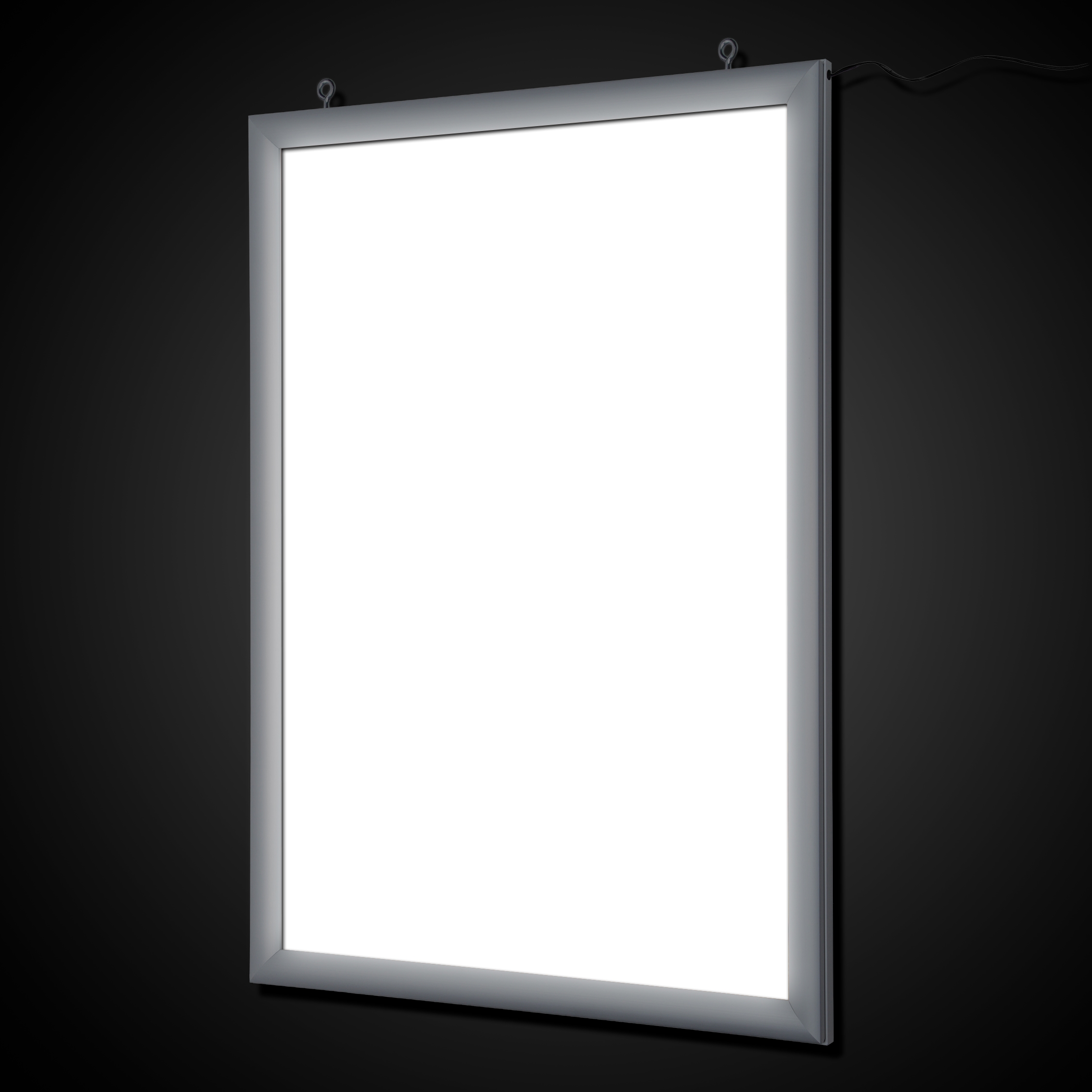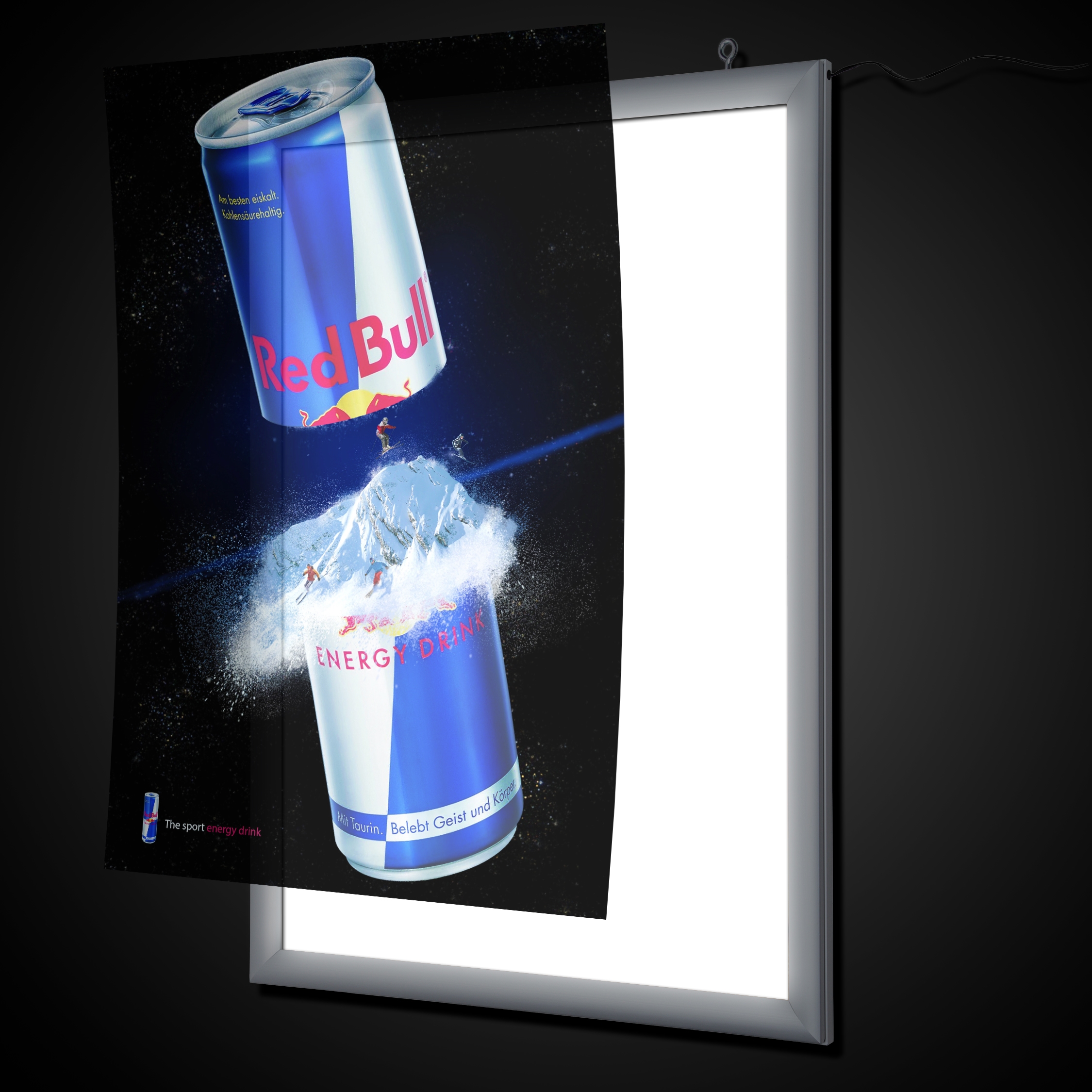 Affischramen har en kraftig belysning pågrund av laserglas bakstycket som består av 12V LED lampor med dagsljus färgtemperatur (5000K) som skinner klart och tydligt med minimal strömförbrukning (32,3 W) och lågt värmeutsläpp. Perfekt till presentation i butiksfönster.