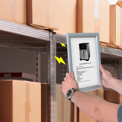 Frontprofilerna är tillverkade av silveranodiserad aluminium med avrundad form, vilket ger ett elegant och professionellt utseende. Snäppfunktionen gör det enkelt att öppna ramarna och byta innehåll på några sekunder. Magnettejpen ger stabil och flexibel montering på alla magnetiska ytor - perfekt för lagerhyllor, dörrar, tavlor och maskiner.
