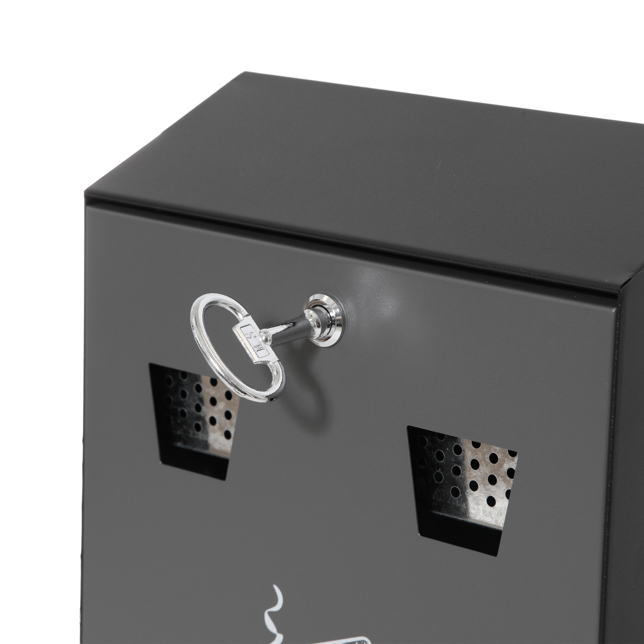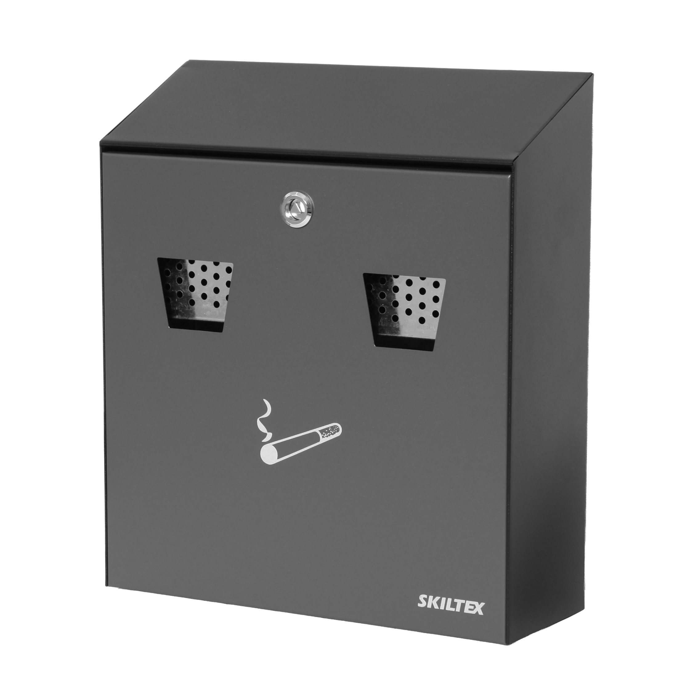 Framsidan kan låsas, har en liten cigarettsymbol på och är utrustad med 2 hål med grill, för enkel bortskaffande av cigarettstumpar.