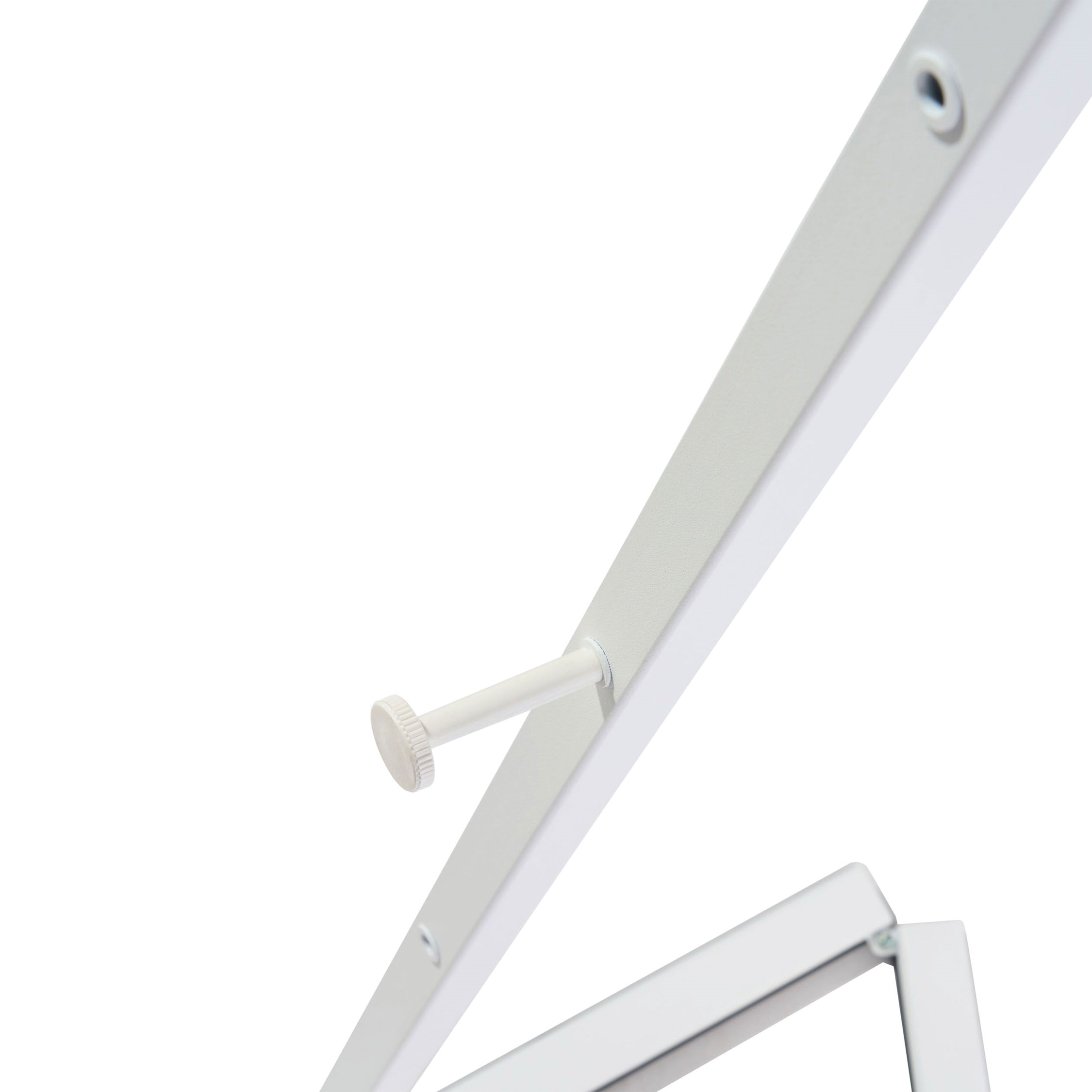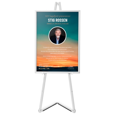 Vitt golvstaffli för snäppramar är en moderniserad version av det klassiska staffliet för målningar. Staffliet är tillverkat av stål med en stilren vit yta. En mycket användarvänlig produkt som sätts upp och packas ihop på under 30 sekunder och transporteras enkelt. Det stöder snäppramar i storlekarna: A4, A3, A2, B2, A1, B1 och A0 i både stående och liggande format.