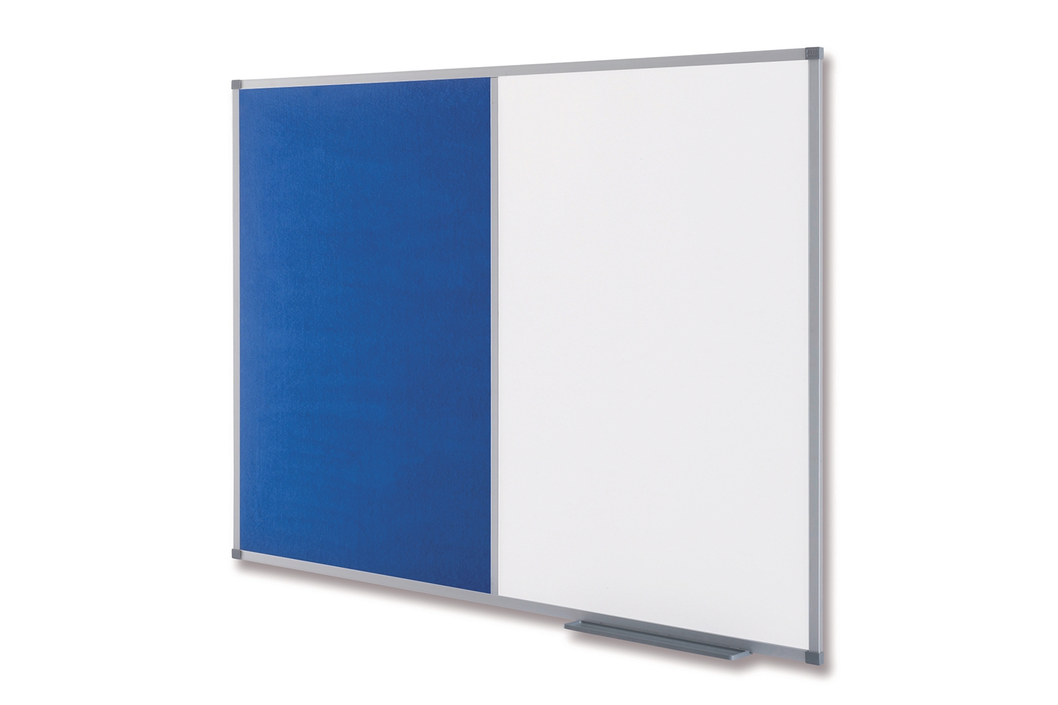 Kombianslagstavla, hälften whiteboard och hälften anslagstavla i blå filt. Få en bättre överblick över vardagen med denna fantastiska kombinationsprodukt. Här får du både en skrivbar whiteboard och en blå filttavla i ett. Praktisk storlek med massor av plats till att skriva, rita och hänga upp saker på tavlans ytor.