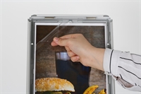 Monterad med 25 mm snäppramar och reflexfri framplatta av typen A-PET som gör det enkelt att byta ut innehållet.