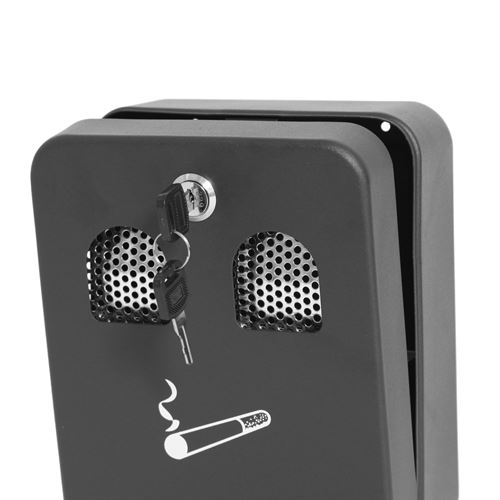 Framsidan kan låsas, har en liten cigarettsymbol på och är utrustad med 2 hål med grill, för enkel bortskaffande av cigarettstumpar.