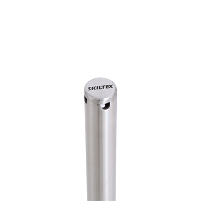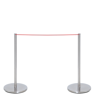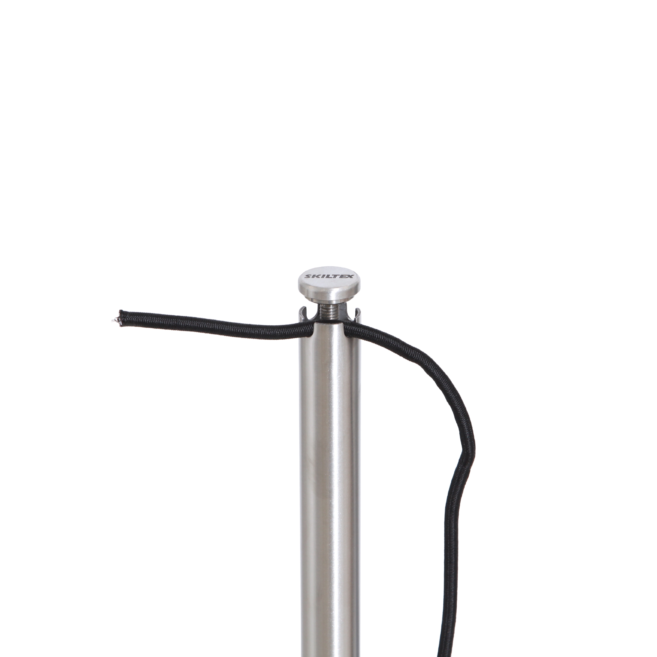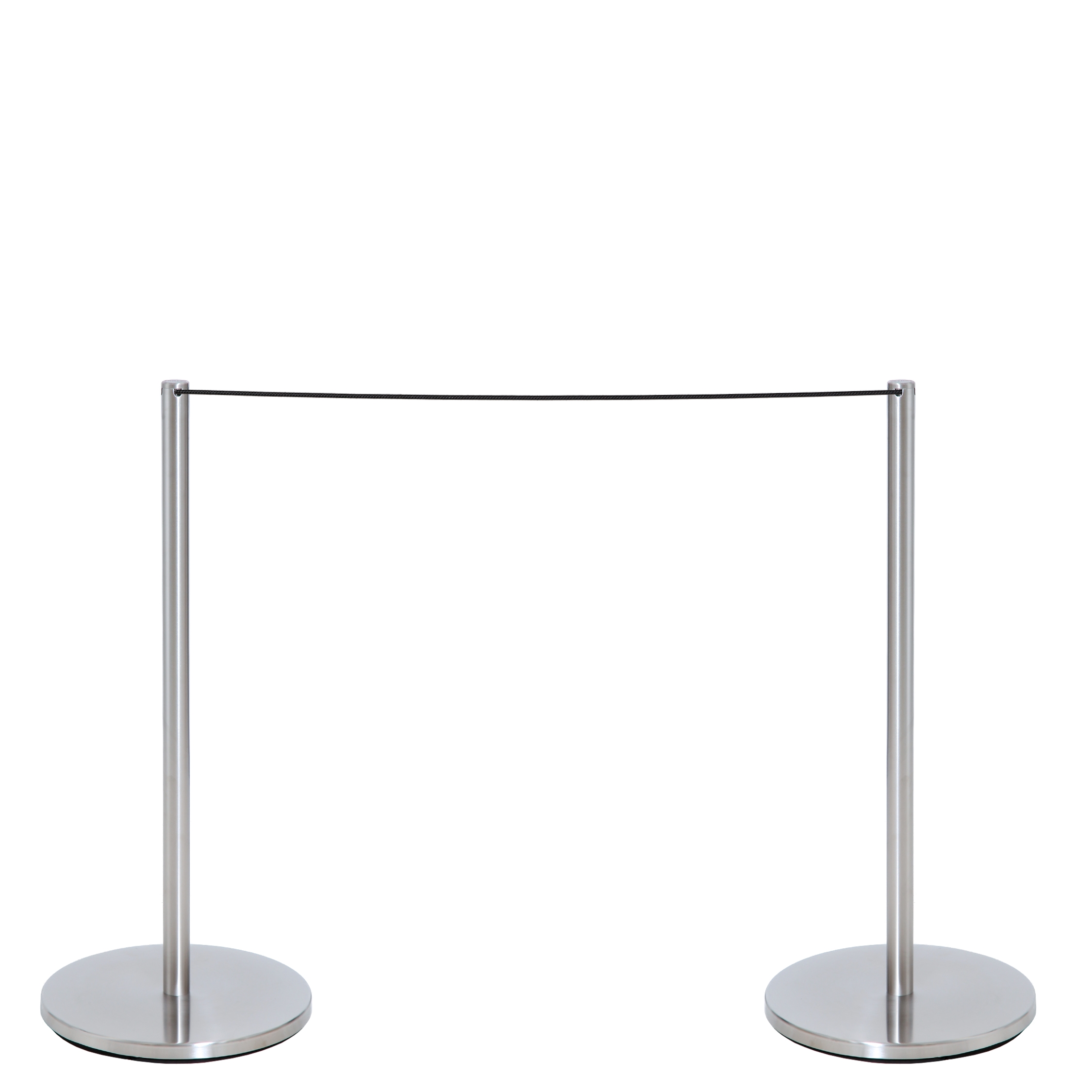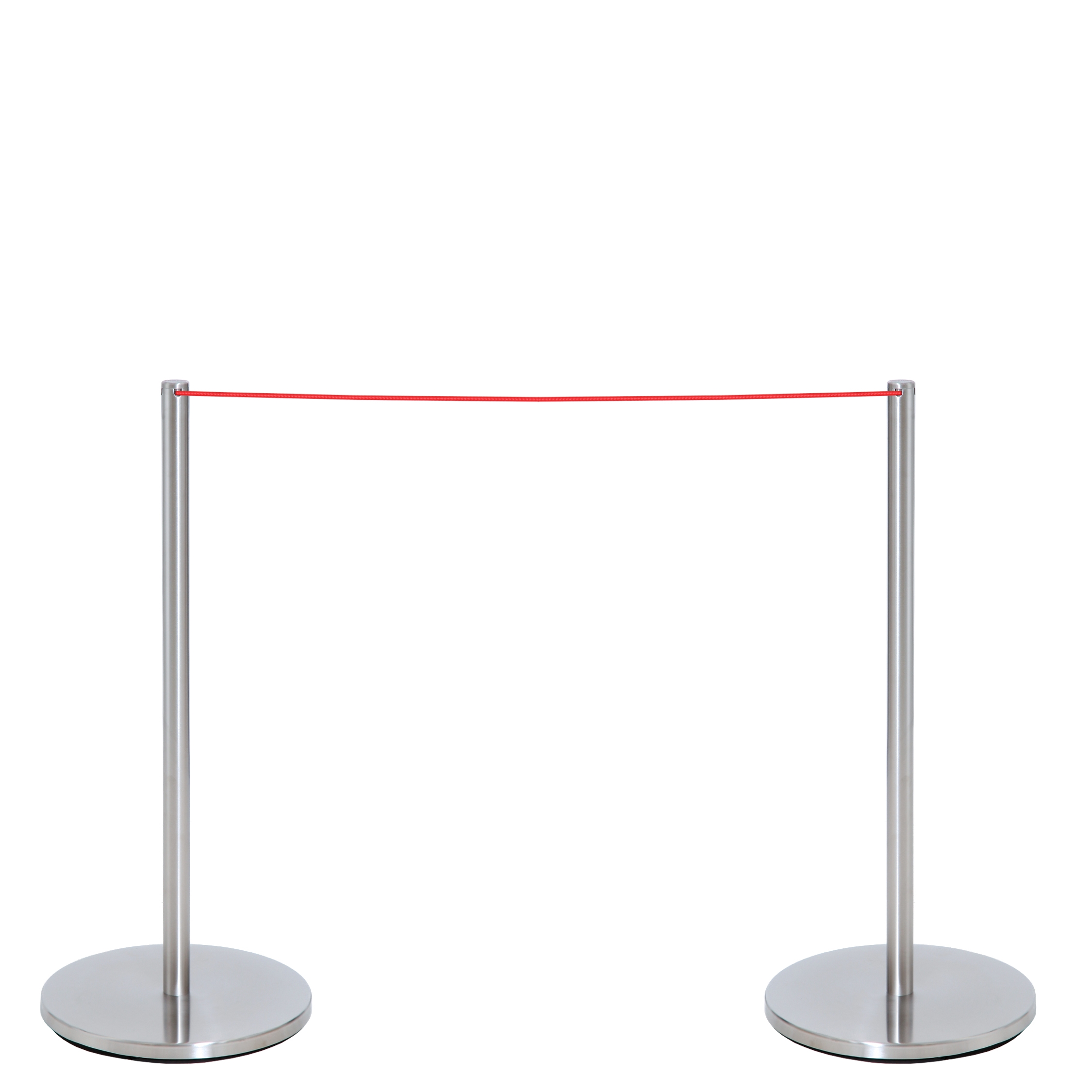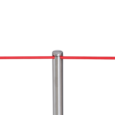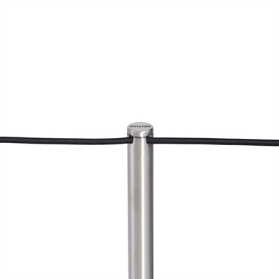 Stolpens smala form i borstat rostfritt stål kombinerat med det tunna elastiska repet skapar en elegant och nästan osynlig avgränsning. Repet finns i rött och svart i 5 eller 25 meter och monteras genom att skruva av toppen, föra repet genom öppningen och fästa det igen. Elasticiteten håller avspärrningen stram även i trappor och lutande ytor.