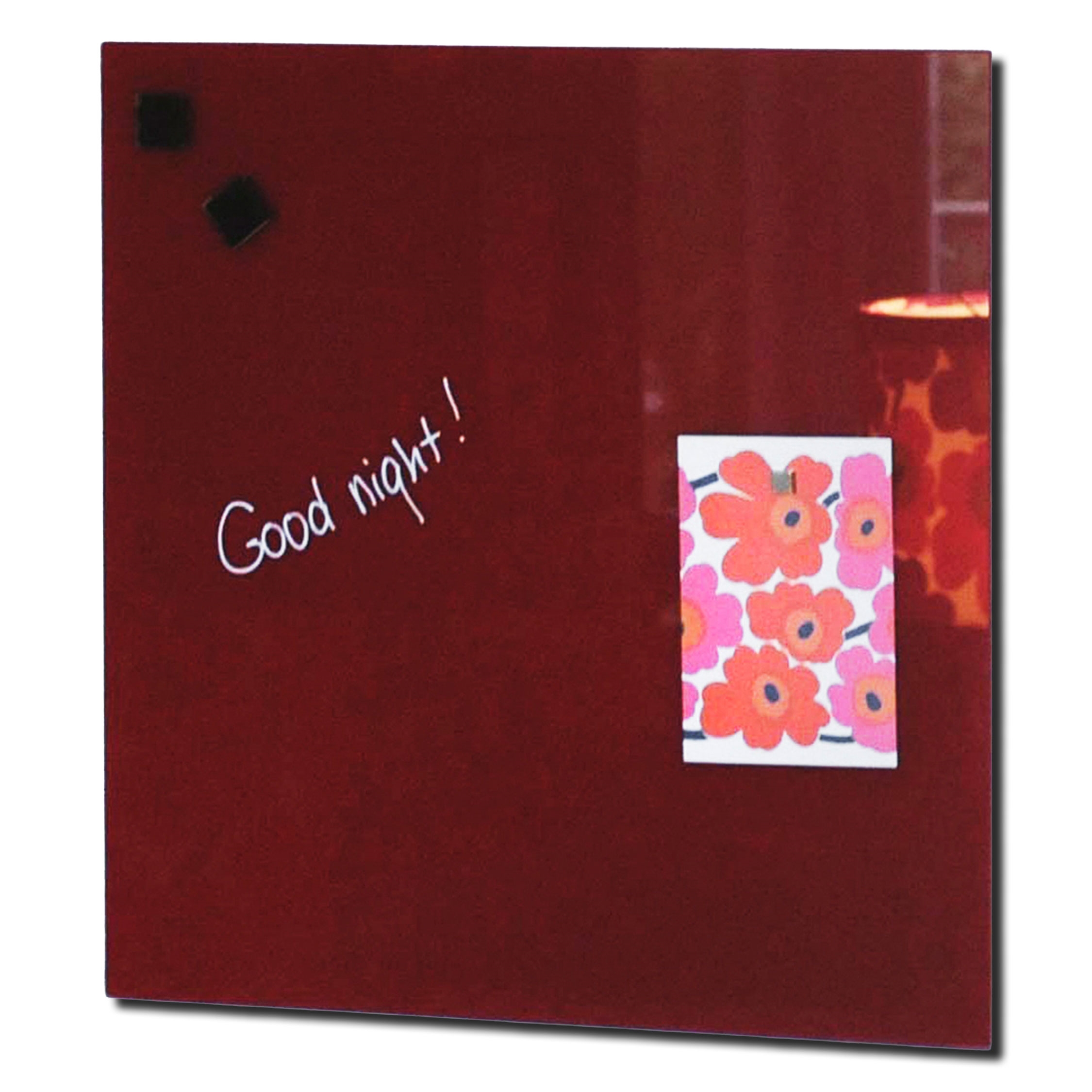 Röd magnetisk glastavla från NAGA, 45 x 45 cm. Med sin varma och hemtrevliga design passar den perfekt i hemmet, i köket eller på arbetsplatser som till exempel skolor, gymnasier, bibliotek, sandwichbarer, kaféer och liknande.