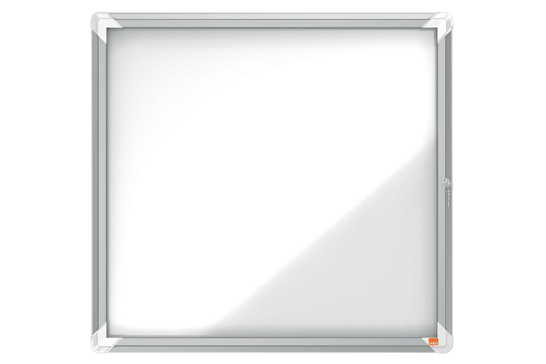 Väderbeständig (IP34) anslagstavla för inom- och utomhusbruk med modern, stillig aluminiumram, hängslad, låsbar dörr i säkerhetsglas och en magnetisk, skrivbar whiteboard yta med 10 års garanti.