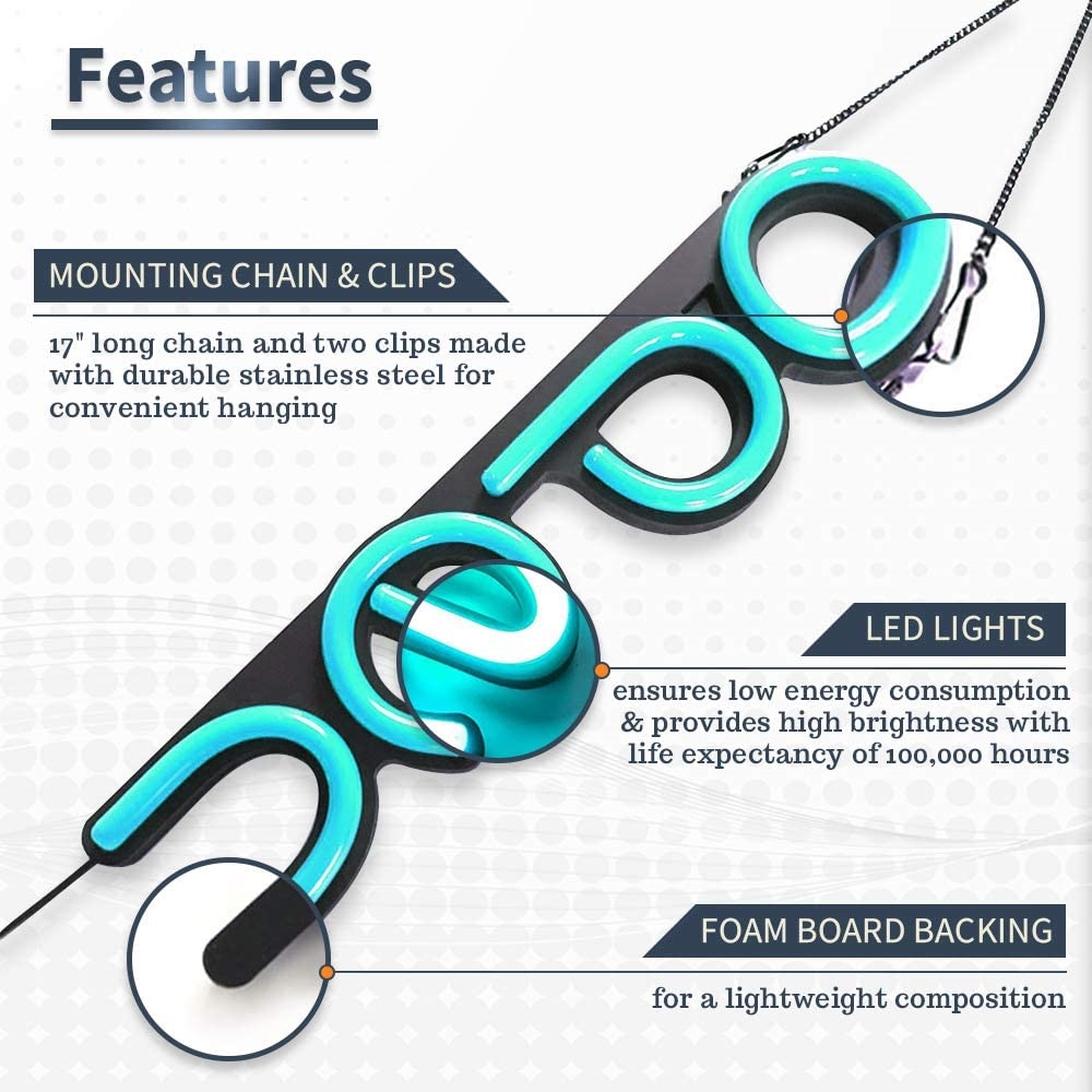 LED skyltarna lyser upp både dagsljuset och nattens mörker. Alla neonskyltar i vårt sortiment är lättviktiga, kommer med kedja och klämmor, som gör det enkelt att hänga upp dem.
