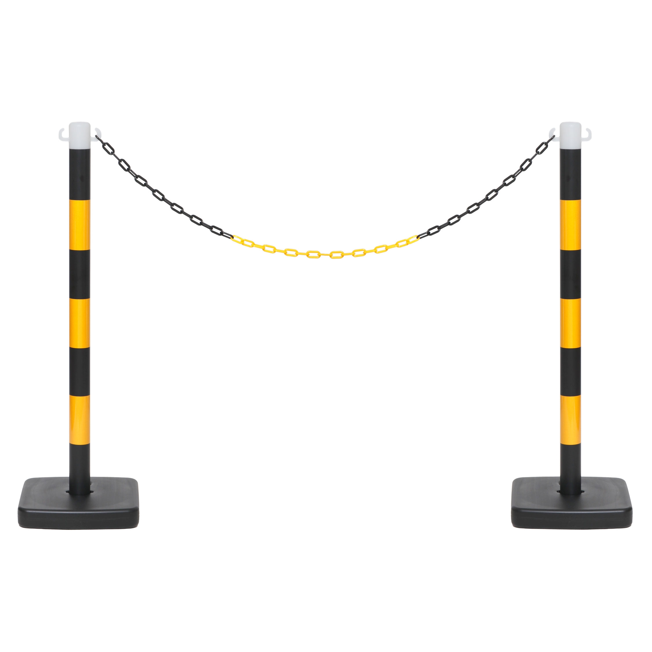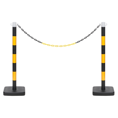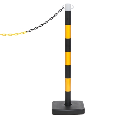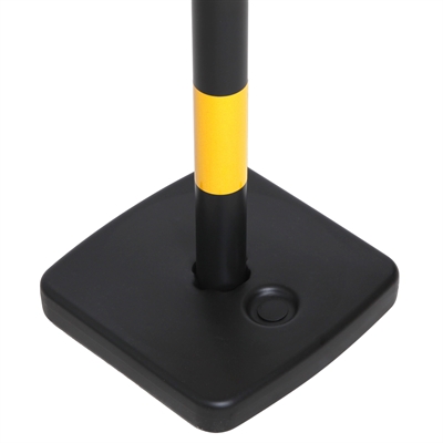 Praktisk och slitstark plaststolpe i svart/gul design för avspärrning och områdesmarkering. Basen kan fyllas med sand eller vatten för extra stabilitet. Perfekt för utomhusbruk vid evenemang, byggarbetsplatser eller parkeringsområden.