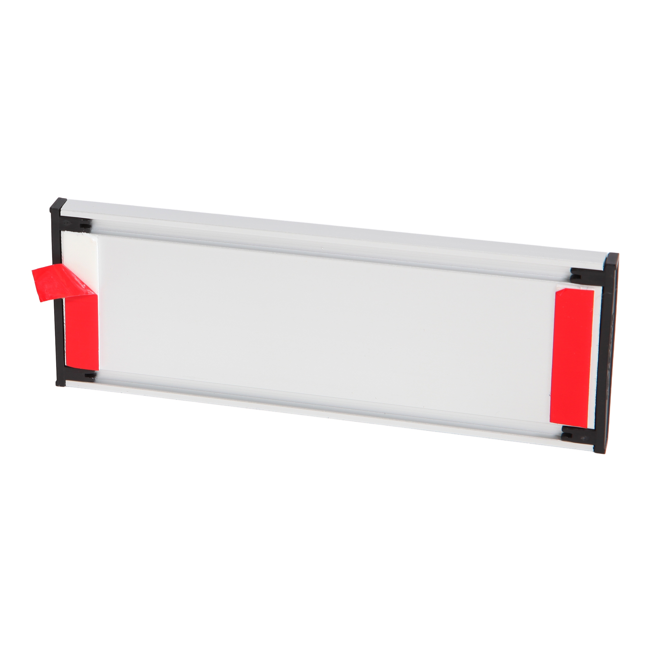 Monteringen är enkel och diskret. Skylten levereras med förmonterad dubbelhäftande tejp av hög kvalitet och kan monteras direkt på dörr eller vägg utan användning av verktyg eller borrning.