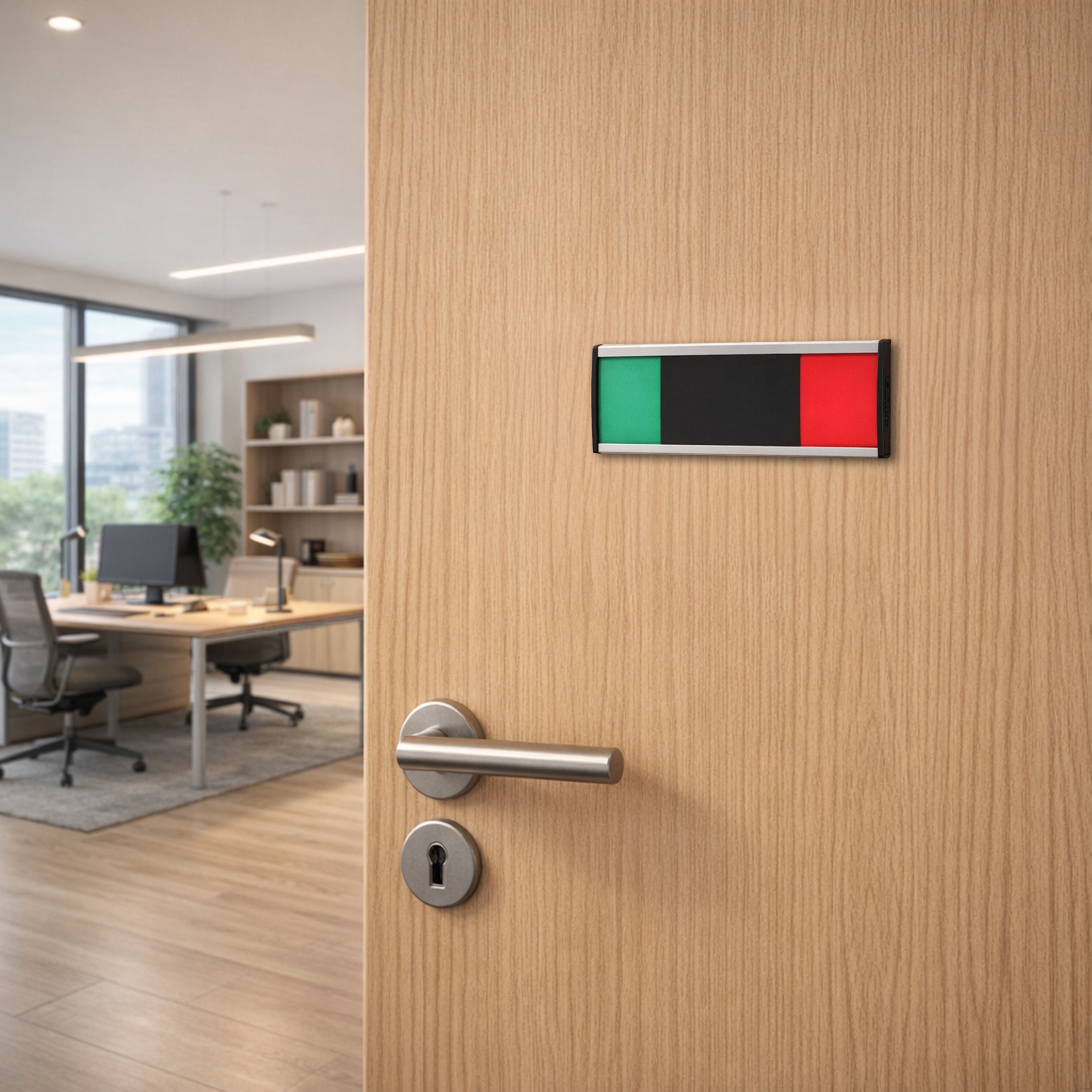 Premium Ledig / Optaget-skylt är en exklusiv och diskret lösning för statusmarkering, där man eftersträvar ett rent, universellt och språkoavhängigt uttryck.