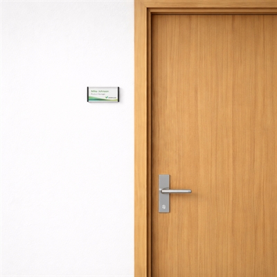 Skylten är utformad för att göra det enkelt att uppdatera namn, avdelningar eller rumsinformation när behovet uppstår. Du byter helt enkelt ut utskriften i skylten.