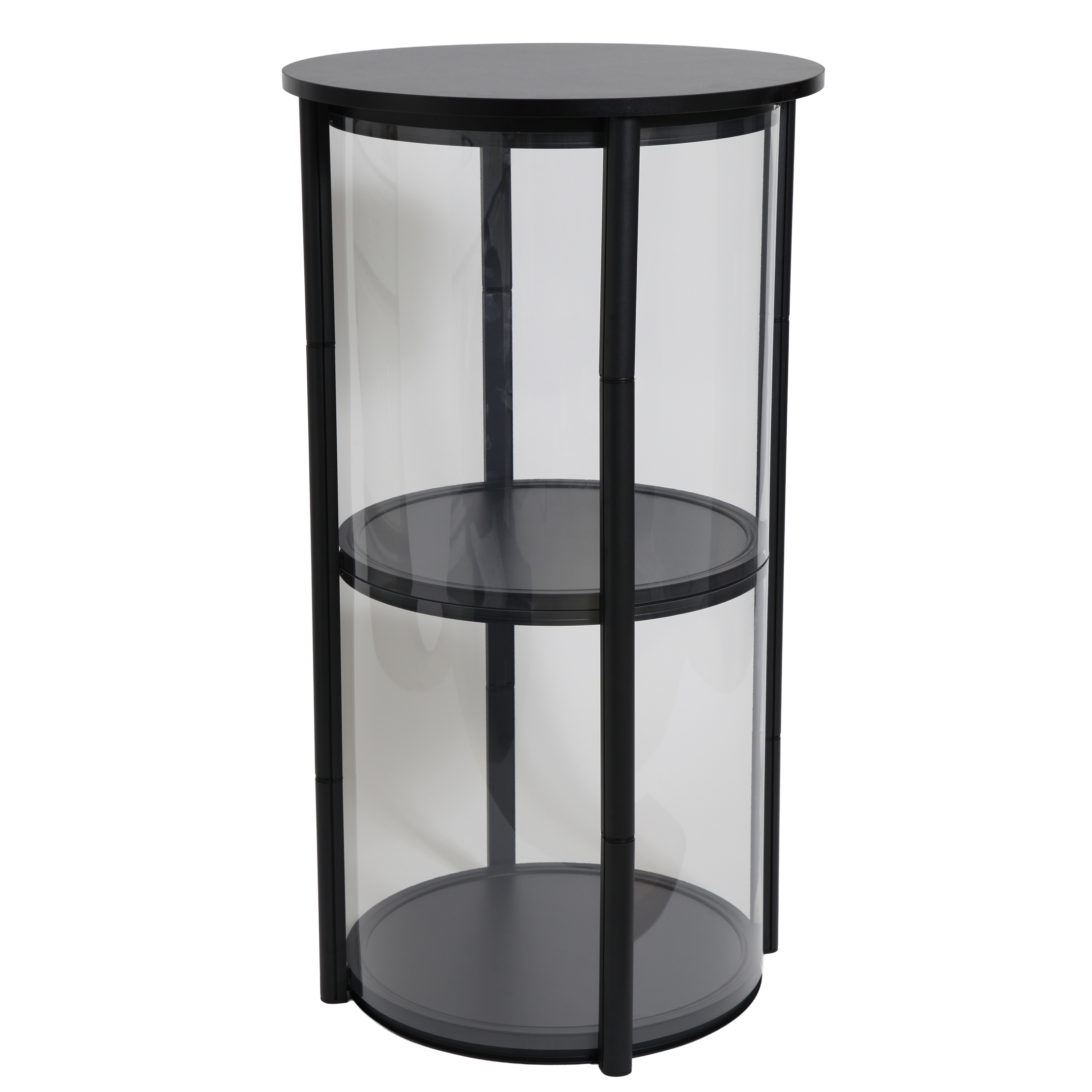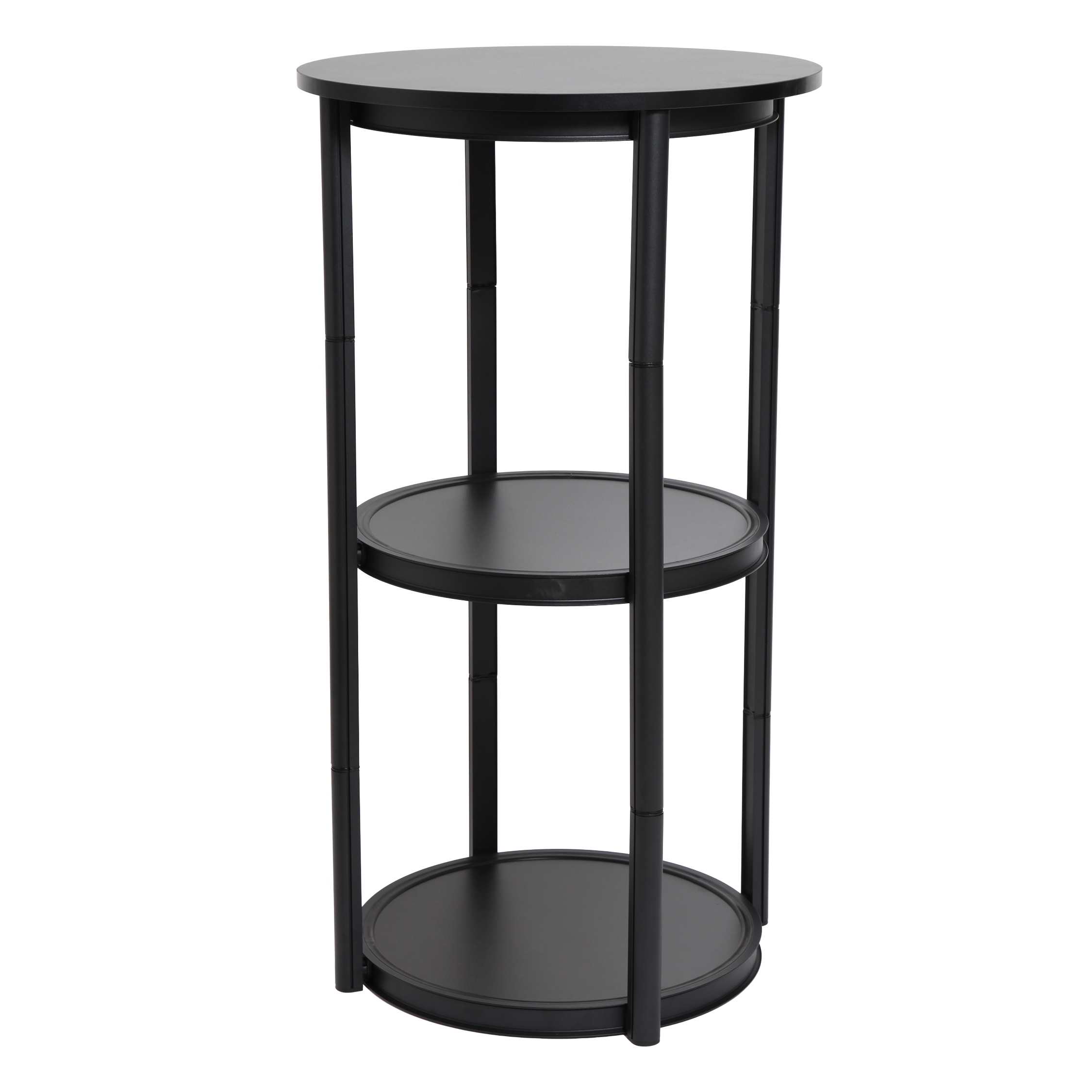 Disken är utrustad med svart bordsskiva och 2 svarta hyllor.