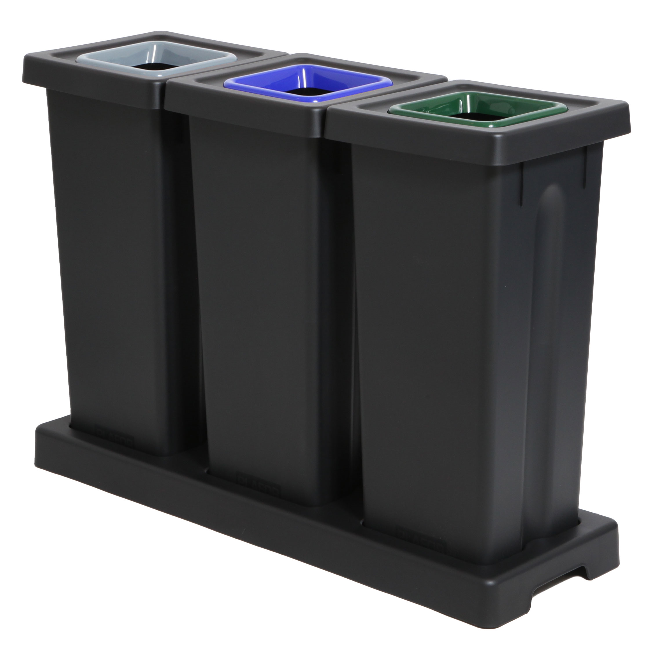 Sorteringssystem i svart, kraftig, 100% återvunnen plast med en kapacitet på 3 x 53 l, med lock i blått, grått och grönt.
