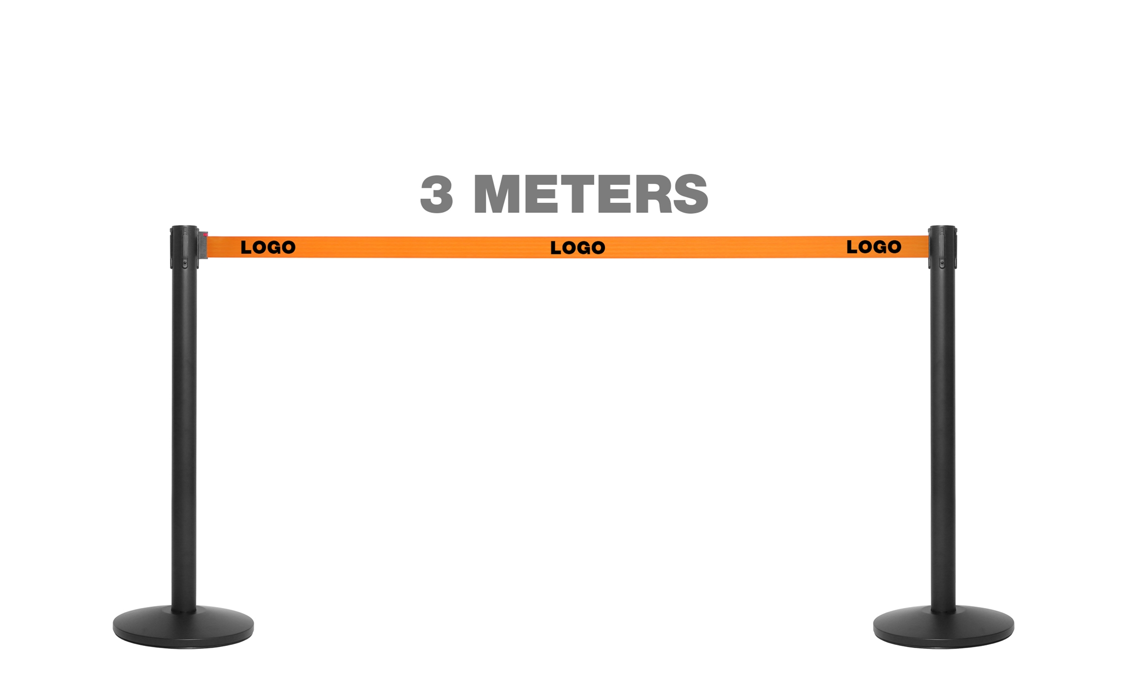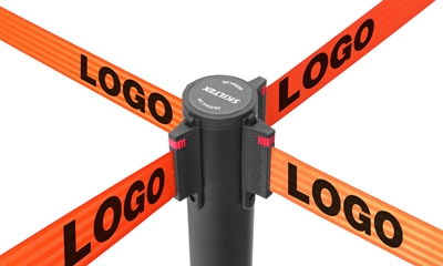 Svarta avspärrningstolpar med användaranpassade tryck på bägge sidor av bandet.