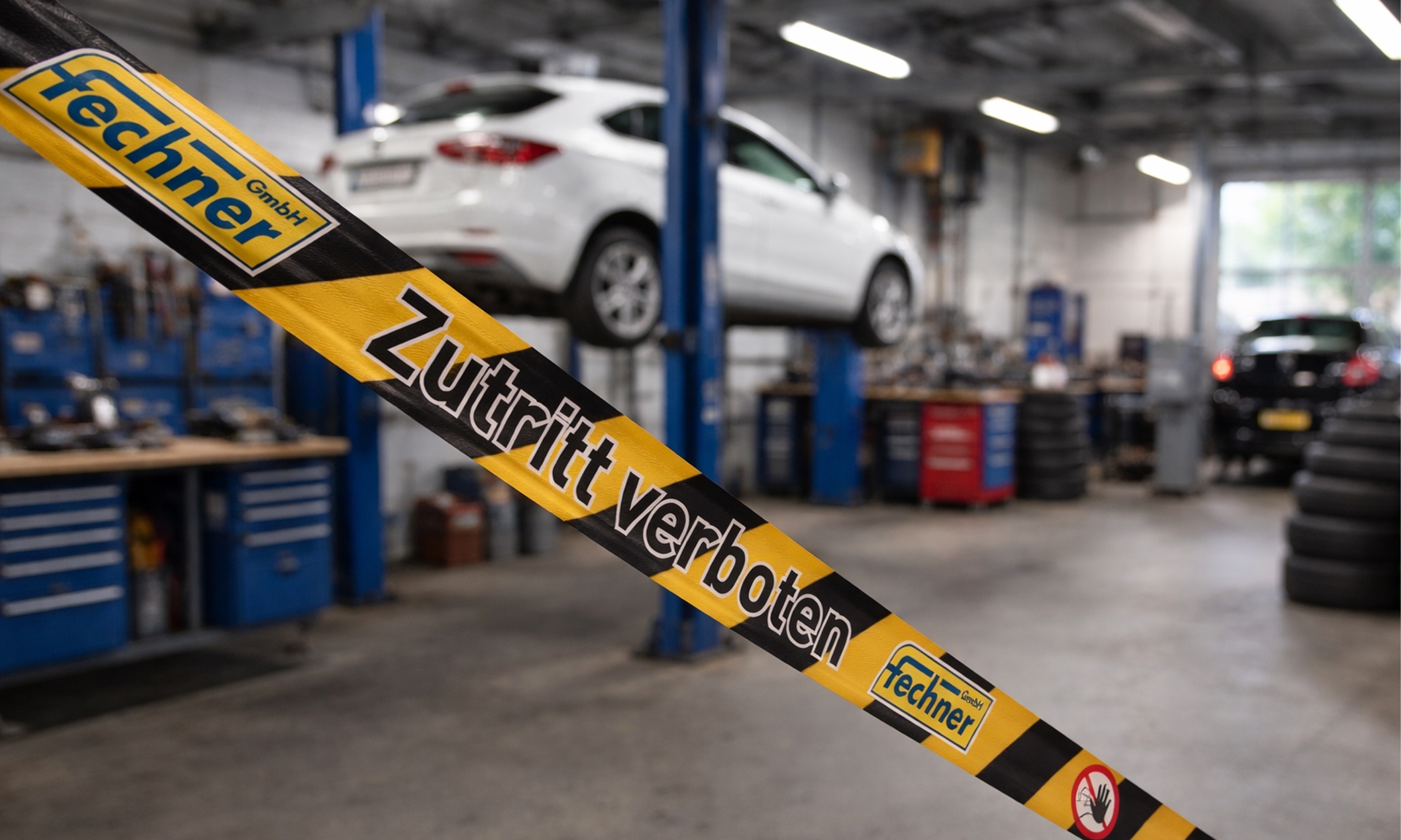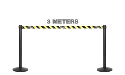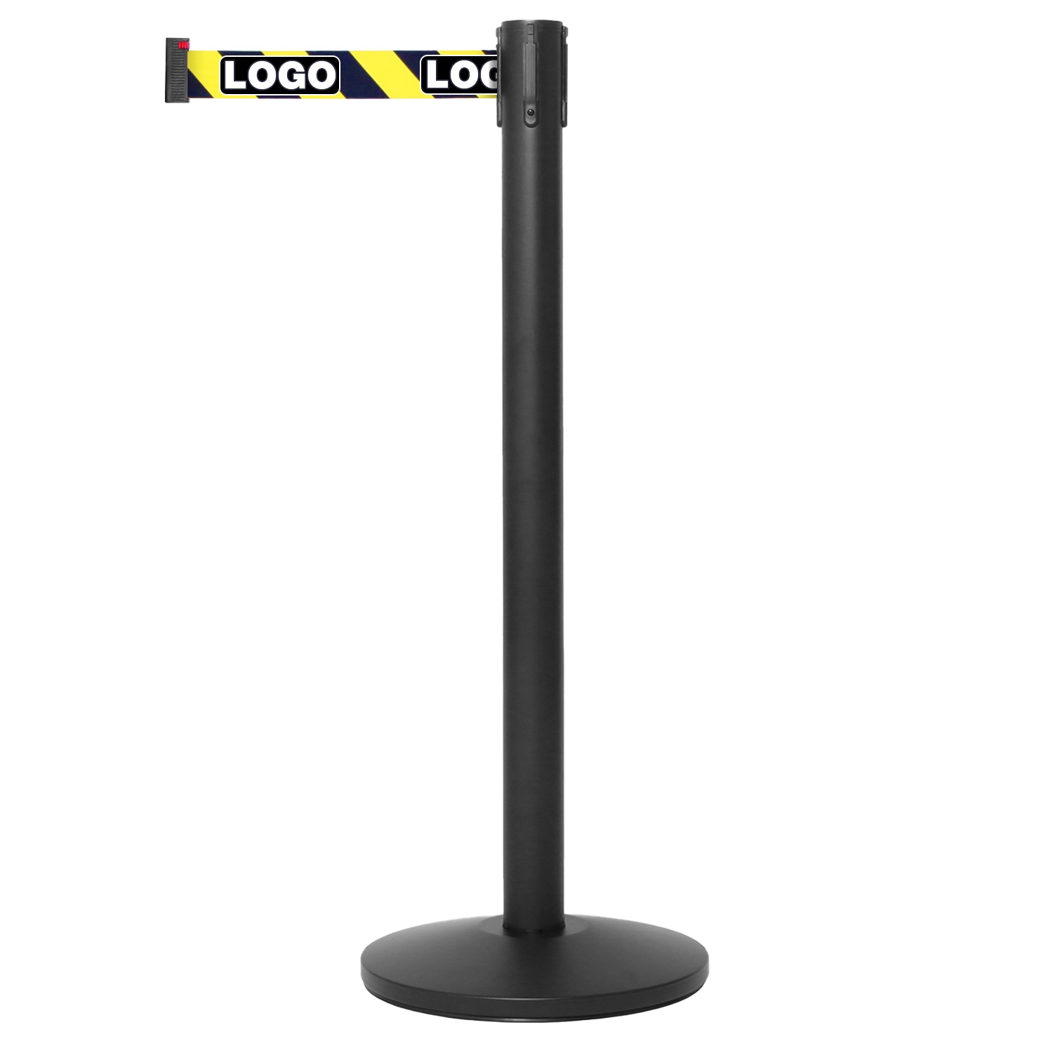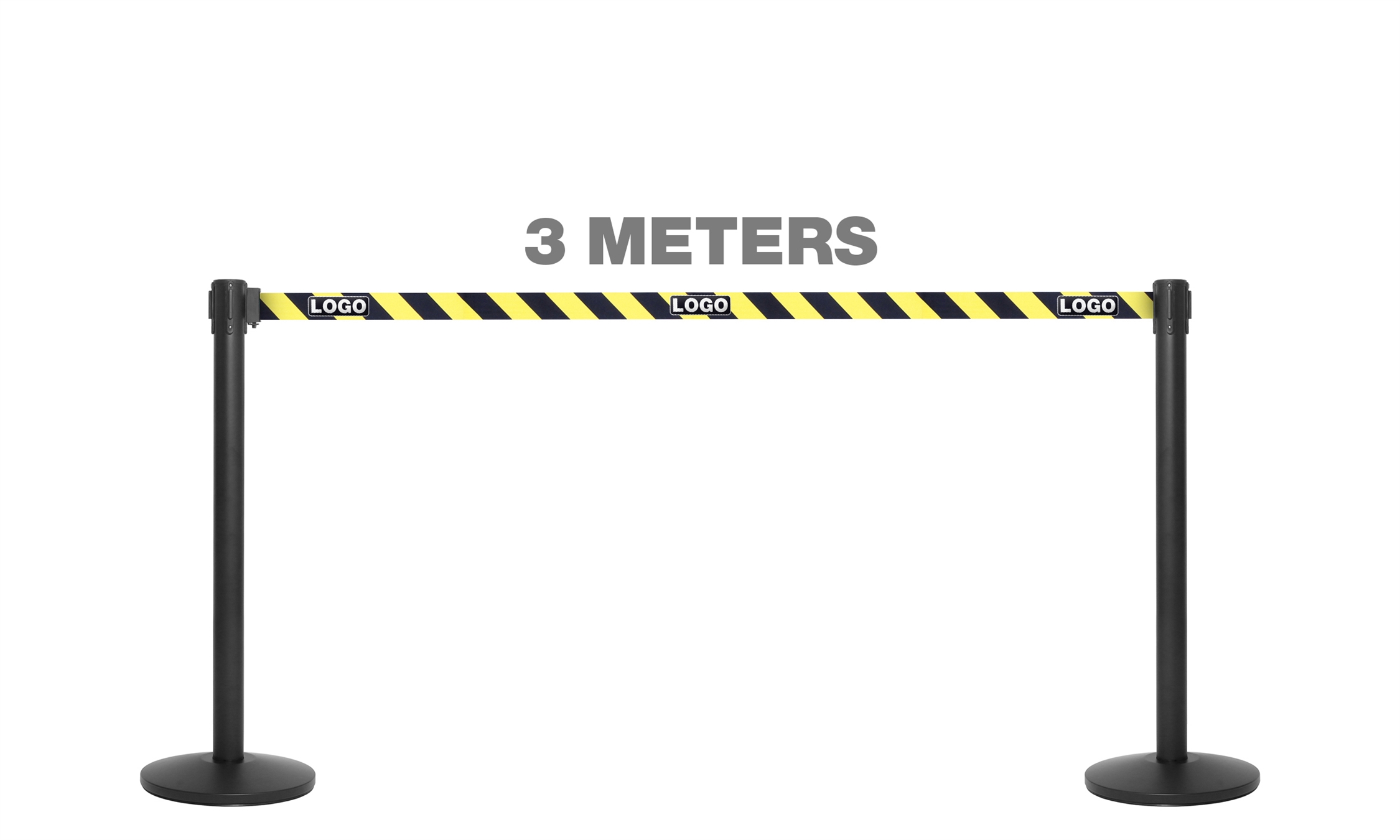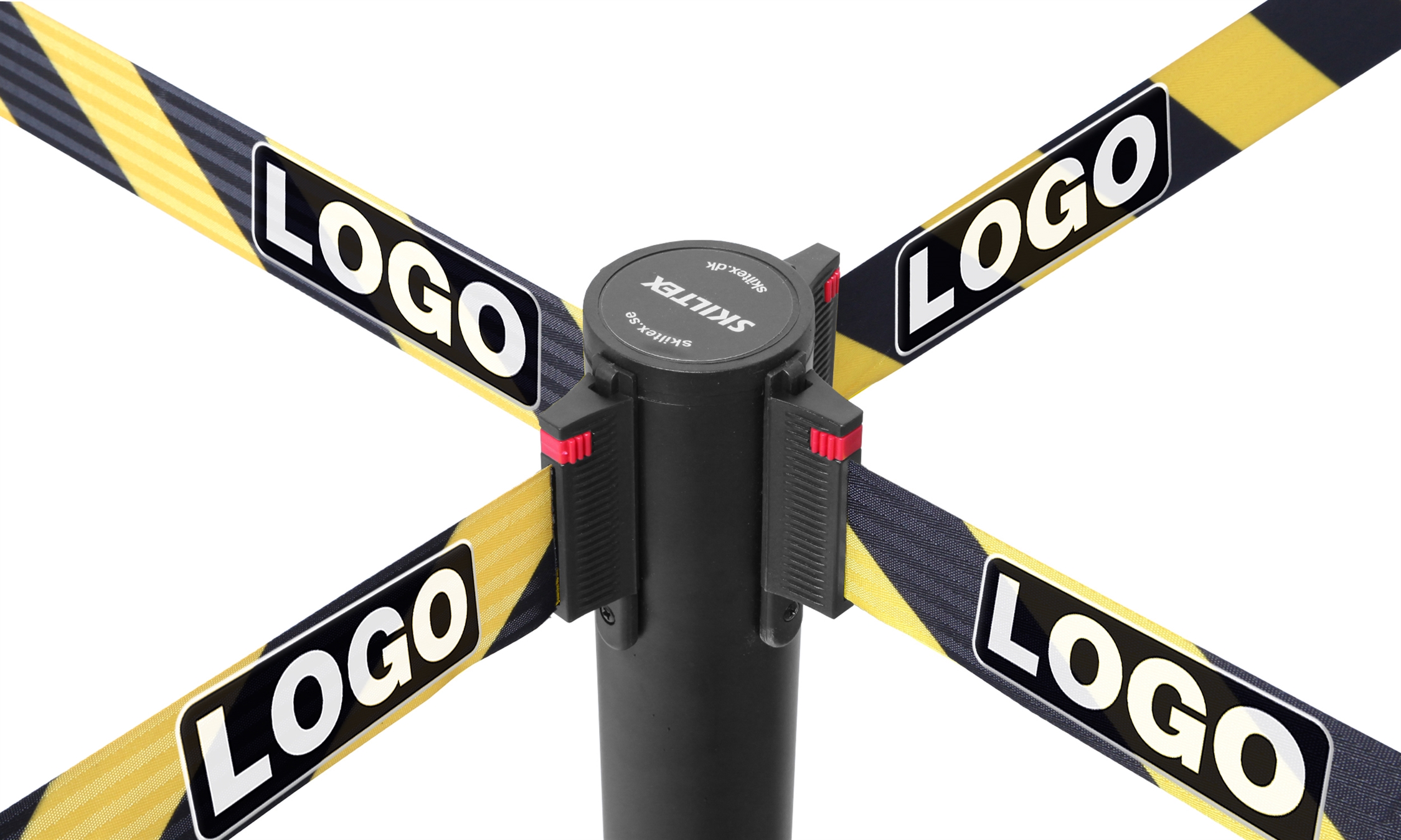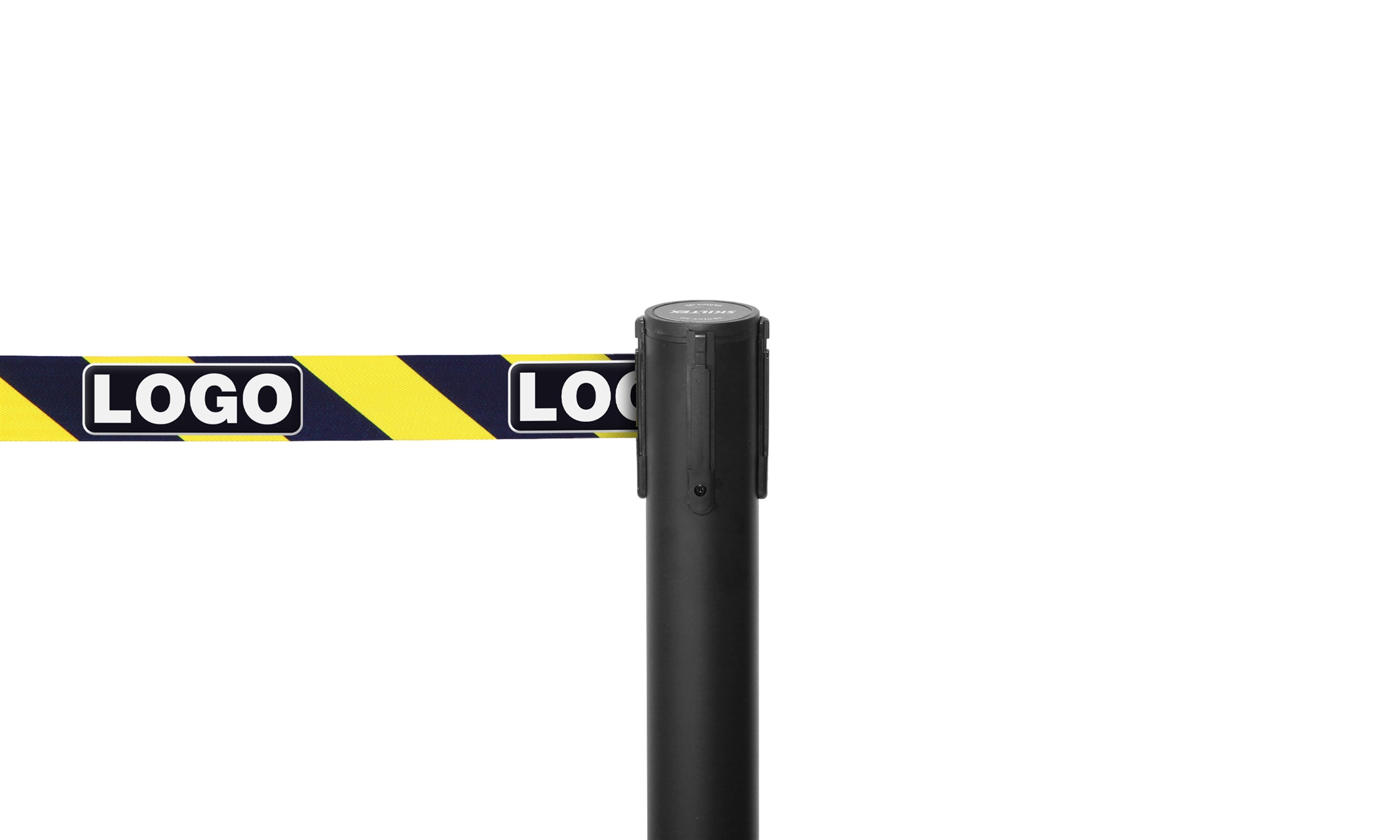 Svarta avspärrningstolpar med användaranpassade tryck på bägge sidor av bandet.