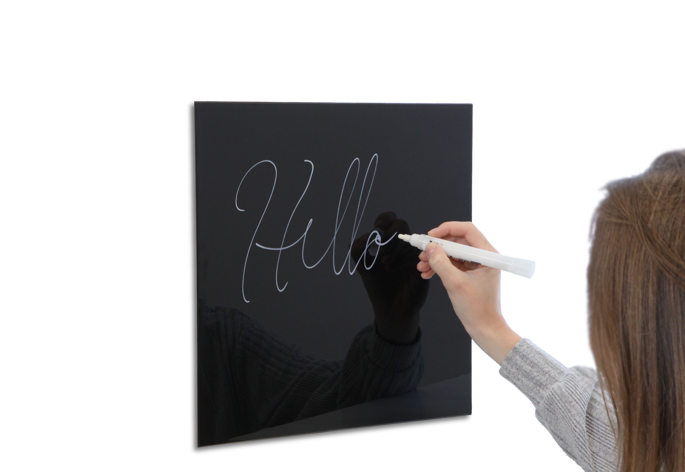 Elegant svart glastavla tillverkad av härdat glas med magnetisk yta för säkert bruk i hemmet eller på kontoret. Tavlans tättsittande och diskreta design ser till att den sitter helt tätt intill väggen. Bakplattan har 4 monteringshål, ett i varje hörna, vilket ger möjlighet att hänga glastavlan både i höjd- och breddformat. Levereras komplett med skruvar för montering och en hvit tuschpenna.