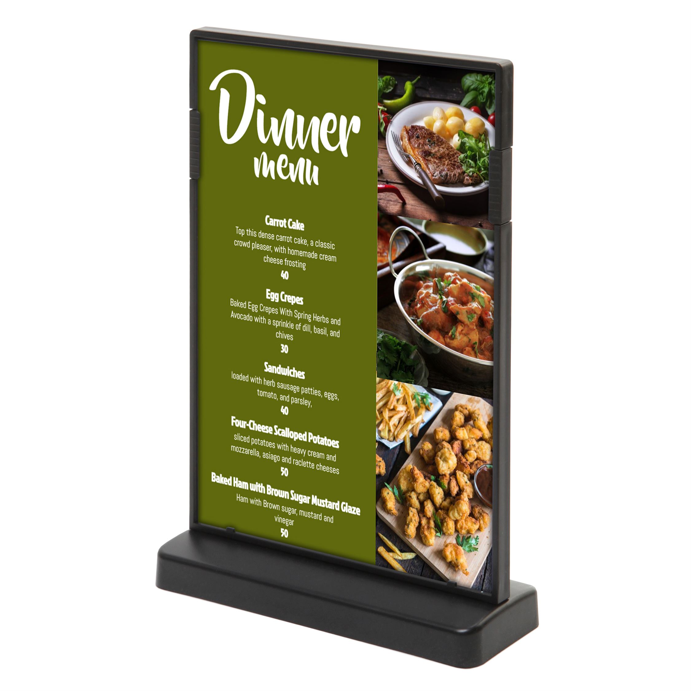 Svarta, dubbelsidiga T-stand Menykortshållare i lodrät riktning med smart klämsystem, framställd i svart, hållbar polypropylen plast. Garanterad stabilitet med stabil bas. Dubbelsidig presentation till insättning och enkelt byte av A5 och A6 ark.