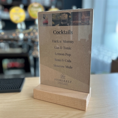 Denna eleganta T-ställ med träfot är den perfekta lösningen för att presentera menyer, erbjudanden eller annonser i ett stilfullt format. Den hållbara ekbasen säkerställer både funktionalitet och estetik, vilket gör den idealisk för professionella miljöer som kaféer, restauranger, hotell och matsalar.