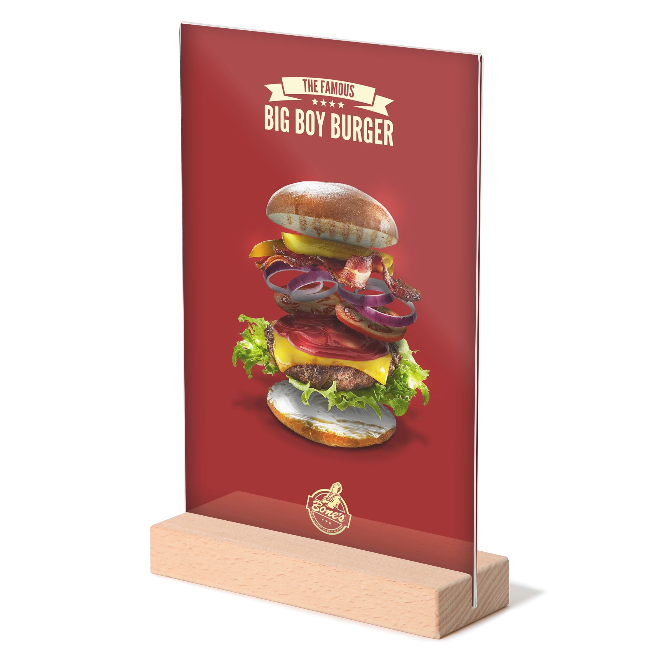 Dessa T-ställ med träfot är idealiska för att presentera menyer, erbjudanden eller annonser på ett elegant sätt. Den robusta bokbasen kombinerar funktionalitet och estetik, vilket gör dem perfekta för användning i caféer, restauranger, hotell och matsalar.