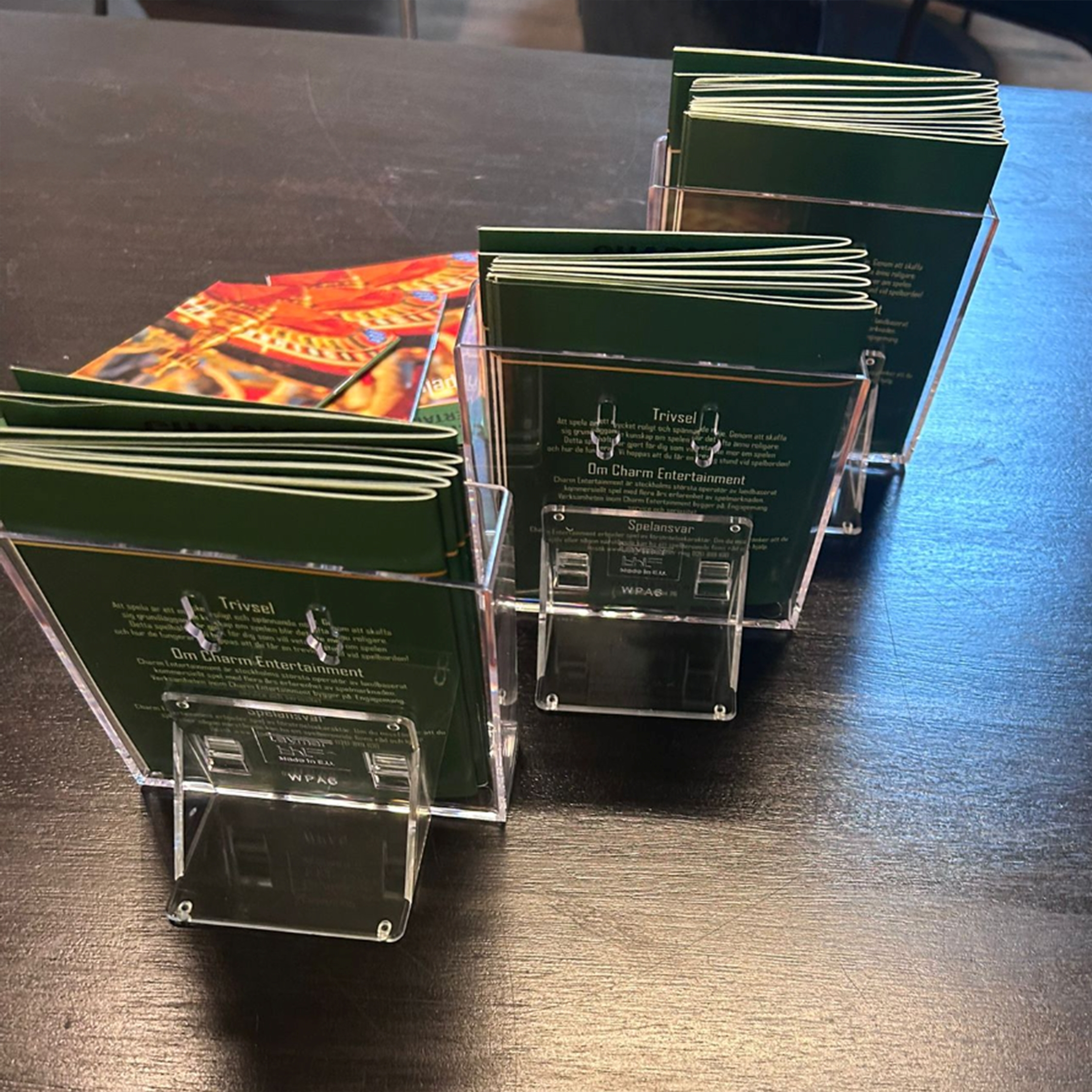 Smarta akryl broschyrhållare från Taymar med avtagbar fot, som både kan användas på bordet eller monteras på väggen.