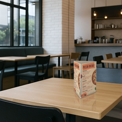 Ekonomisk och platsbesparande menyhållare med tre vertikala sidor för optimal presentation av menyer och prislistor i A4-format.
