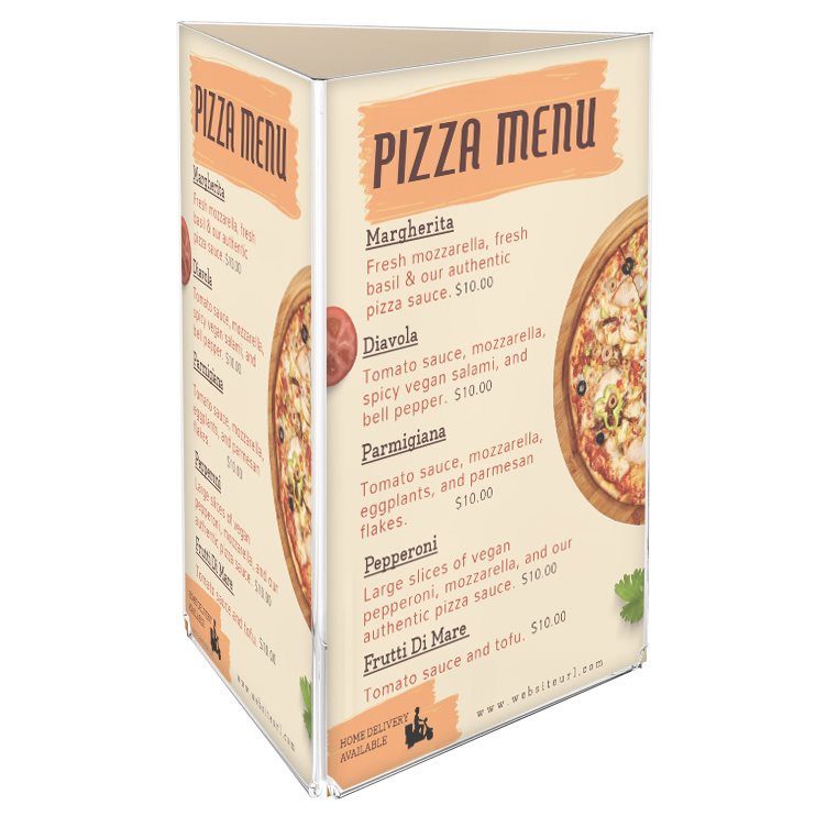 Vertikal tresidig menyhållare tillverkad i 2 mm akryl av hög kvalitet som ger ett kristallklart och professionellt utseende. De tre sidorna gör den idealisk för visning av menyer och prislistor på bord i restauranger och caféer.